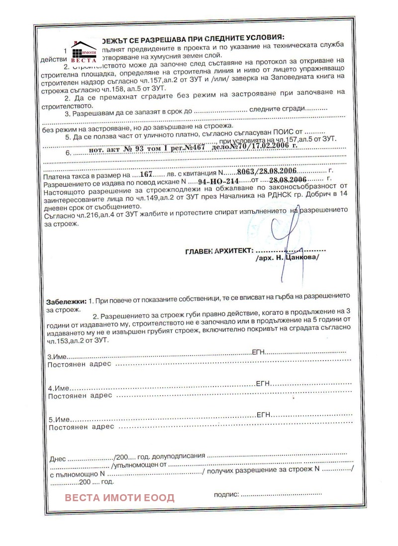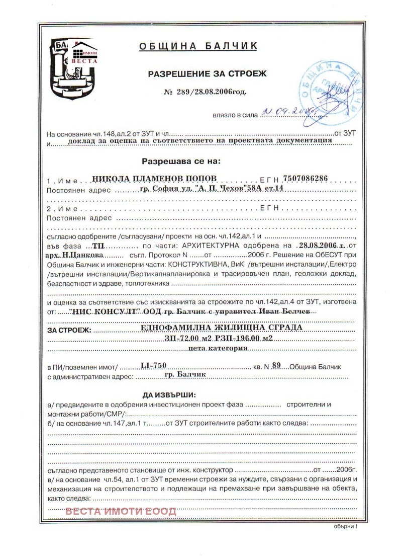 Агенция ВЕСТА ИМОТИ предлага за продажба парцел, находящ се в центъра на гр. Балчик. Парцелът има ПУП и разрешително за строеж за еднофамилна жилищна сграда със ЗП от 72 кв.м и РЗП 196 кв.м. ВЕСТА ИМОТИ извършва необходимите проверки на имота, който сте избрали, организира всички етапи на сделката до нейното финализиране. Оказваме съдействие за отпускане на банков кредит.