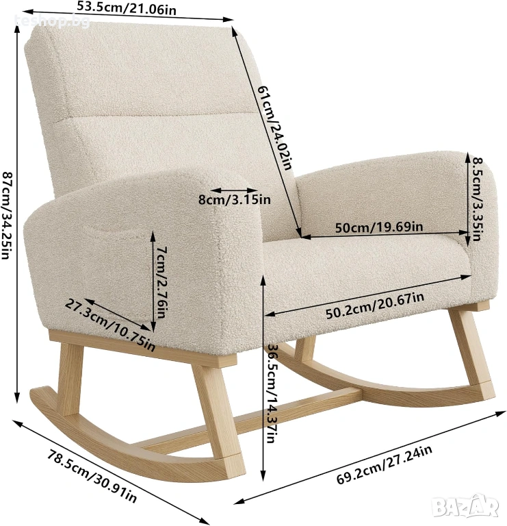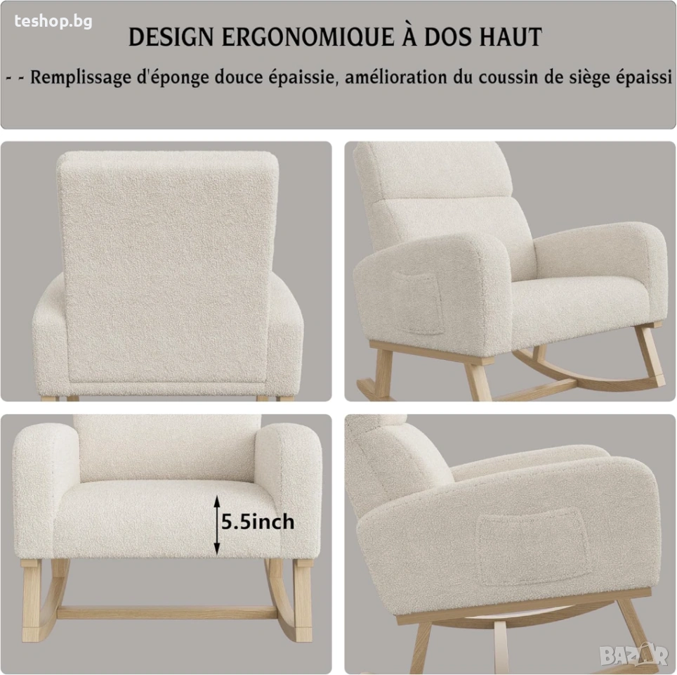 Здрав и издръжлив: Дървената конструкция прави люлеещия се стол много здрав, дебелото тапицерие и фините шевове гарантират устойчива на деформация повърхност, а дългите и извитите крака са от дърво, което предотвратява надрасквания.