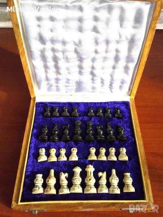 Шахматен комплект закупен в Тайланд за 70$. Неизползван. Махагонова кутия с размер 22см. Велурена облицовка отвътре. Керамични фигури. Размер на царя 4,5см