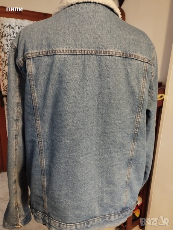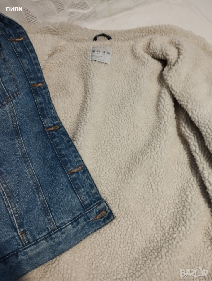 Дамско яке деним с топла подплата, дължина на ръкав 62см., гръб от рамо до рамо 46см., гръдна обиколка120см., дължина на якето от тила до долу 65см., без забележки.