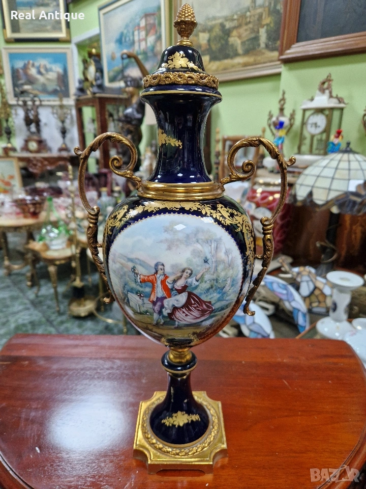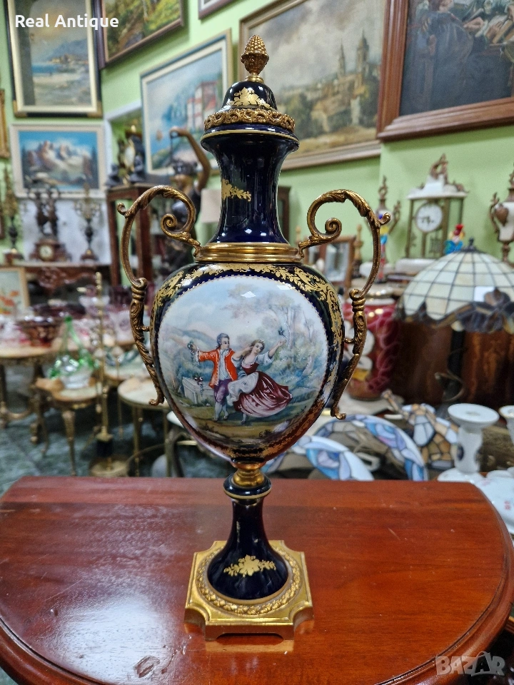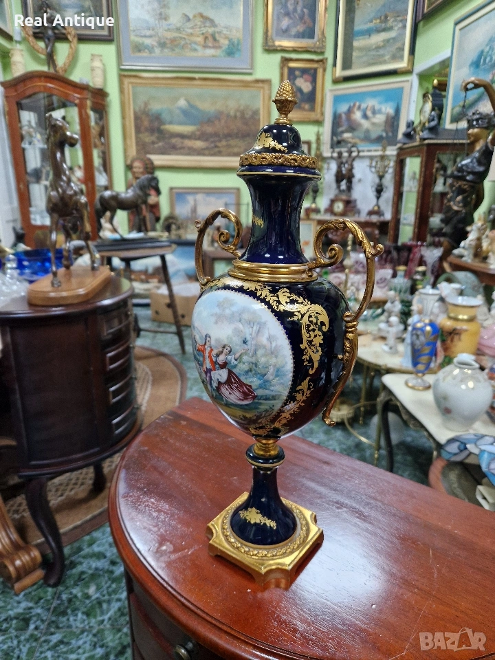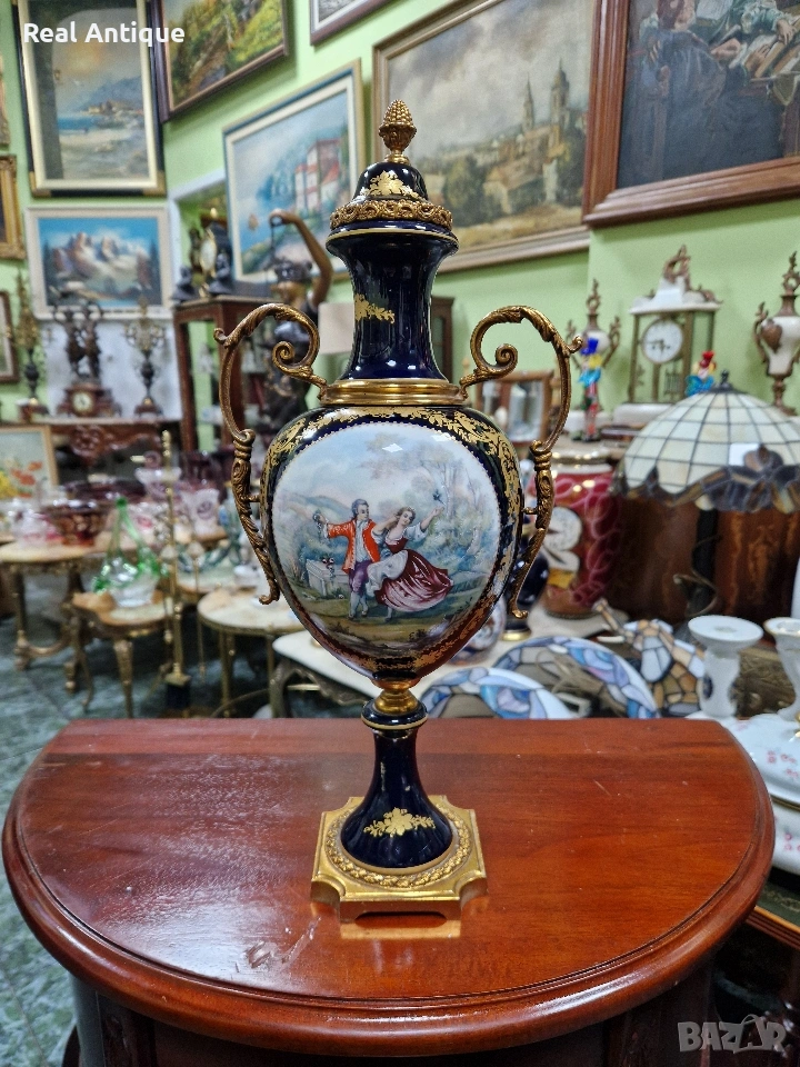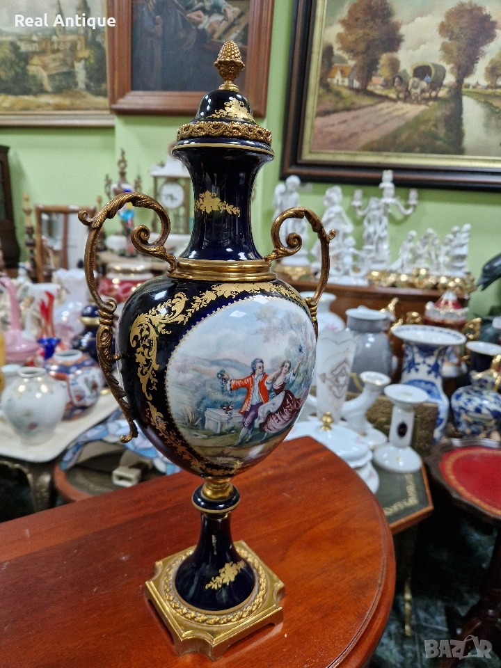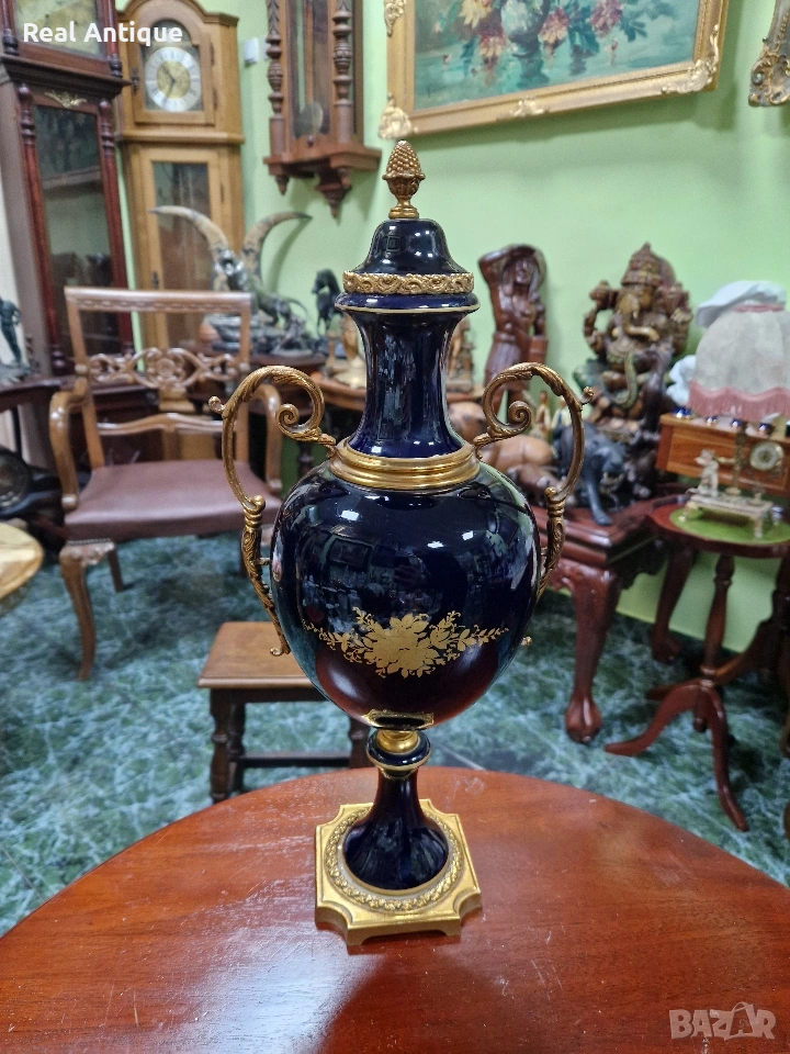 Уникална антикварна френска порцеланова амфора бронз син кобалт → Обява 53473197