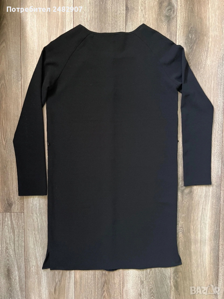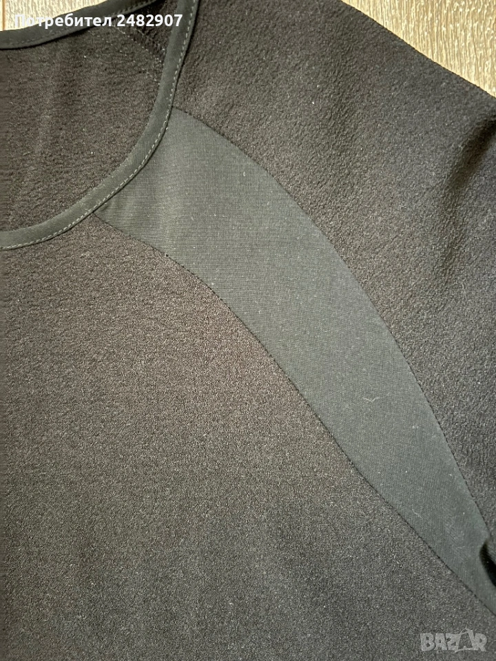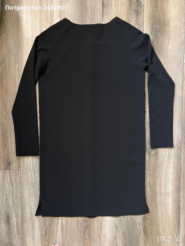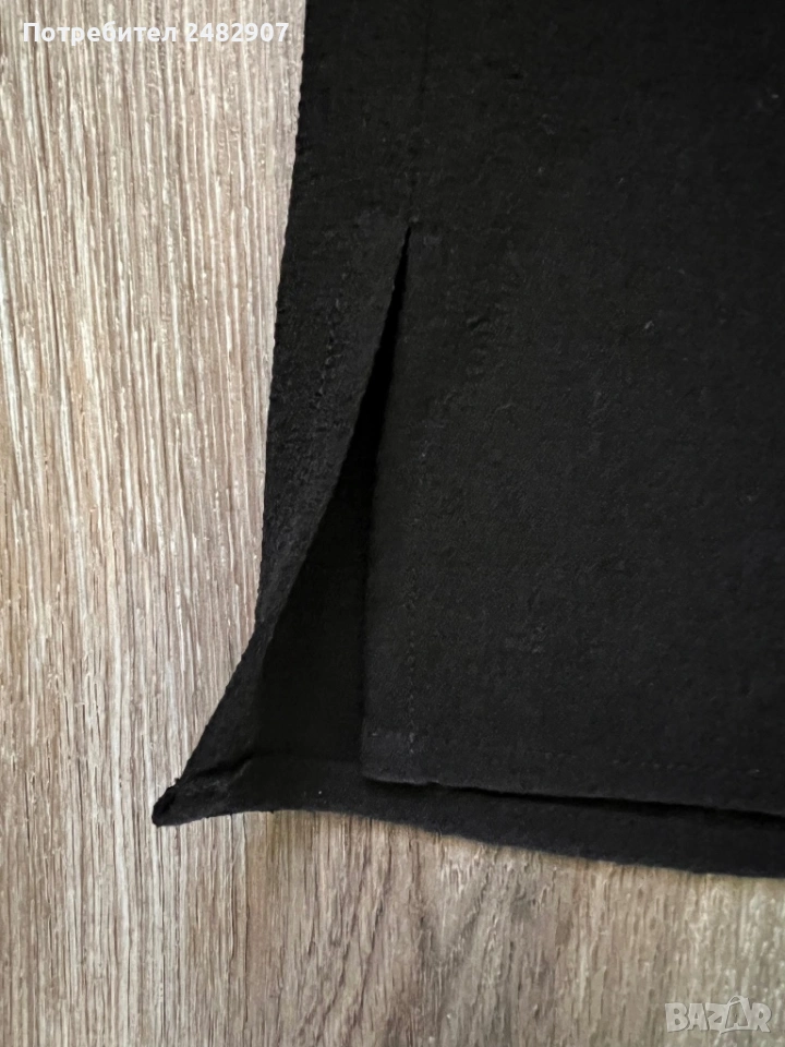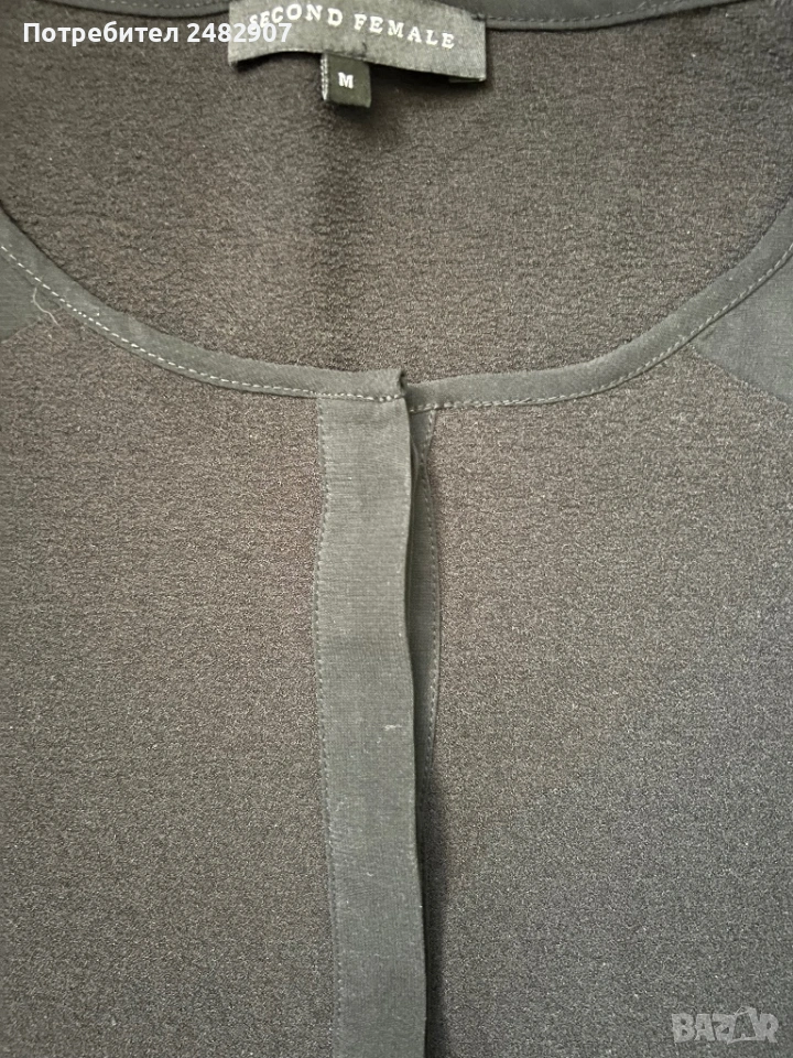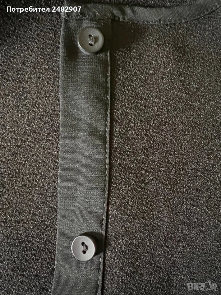 Черна дълга дамска риза от тънък ефирен плат, размер М. ширина под мишниците - 52 см, ширина в долната част - 52 см, дължина от рамото до долу - 95 см, дължина на ръкава от деколтето - 72 см, ширина на ръкава в долната част -11 см. Много запазена, почти не е използвана, с малки цепки отстрани и скрити копчета отпред.