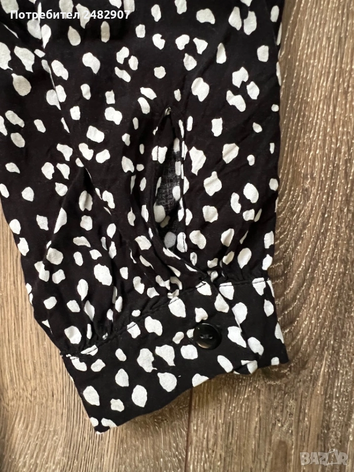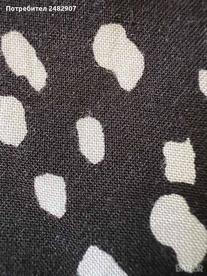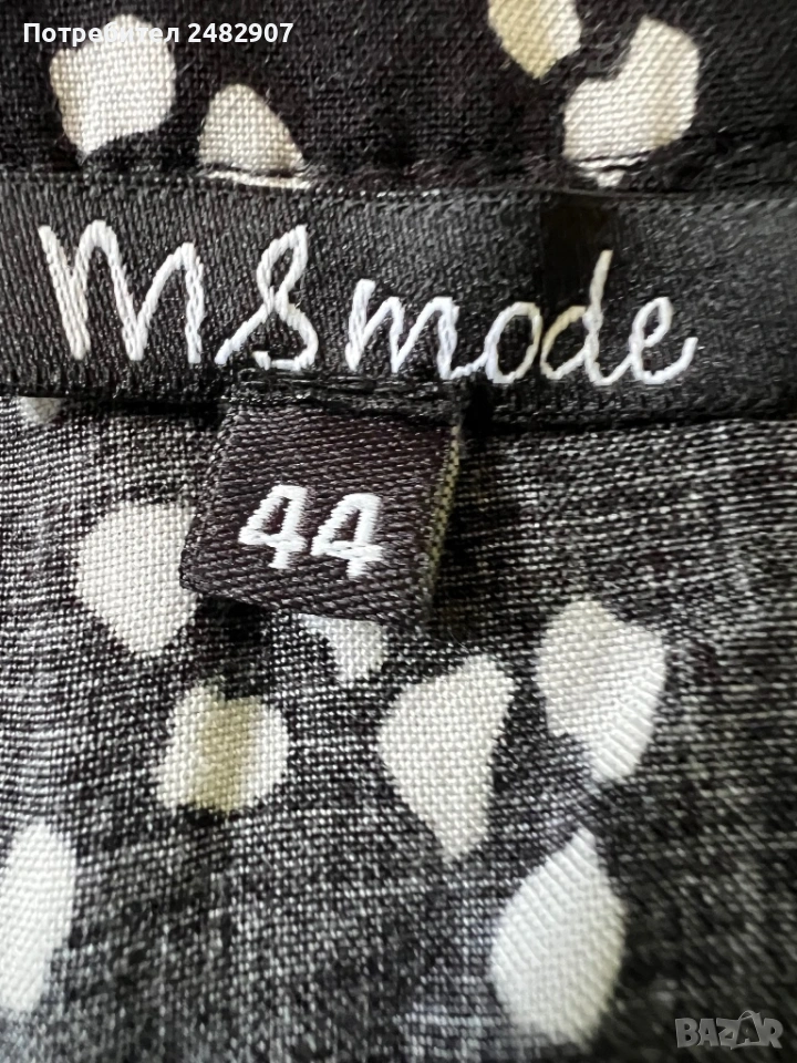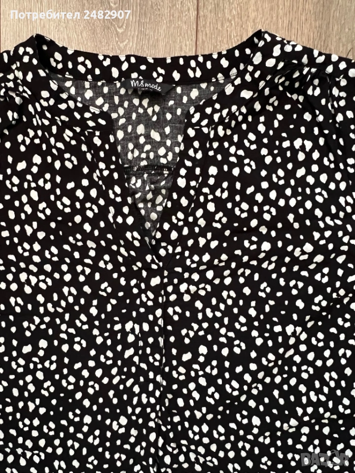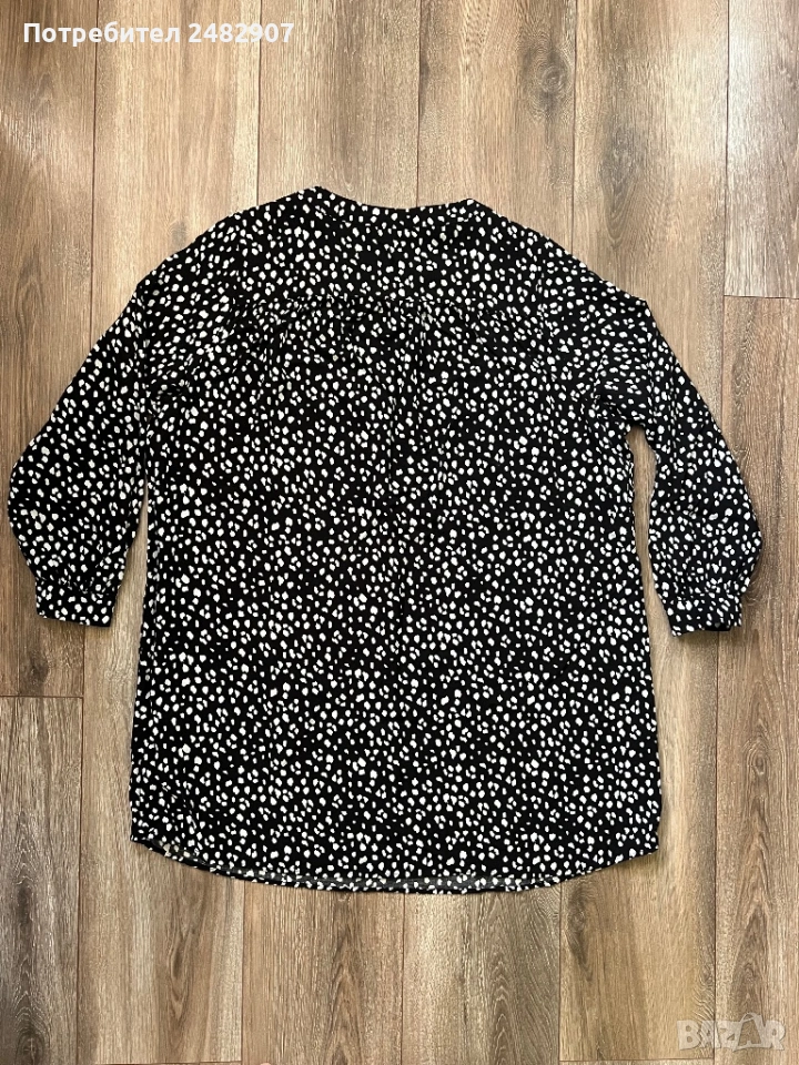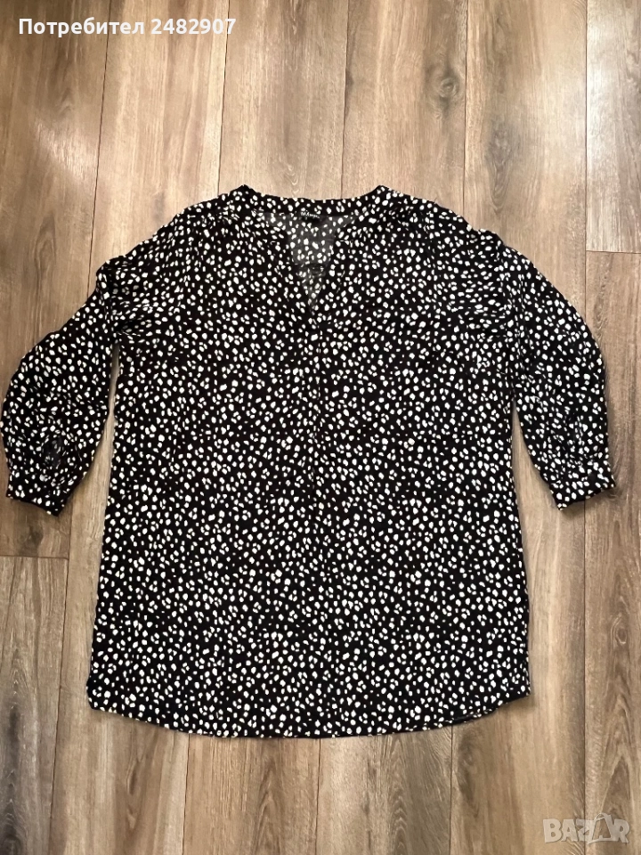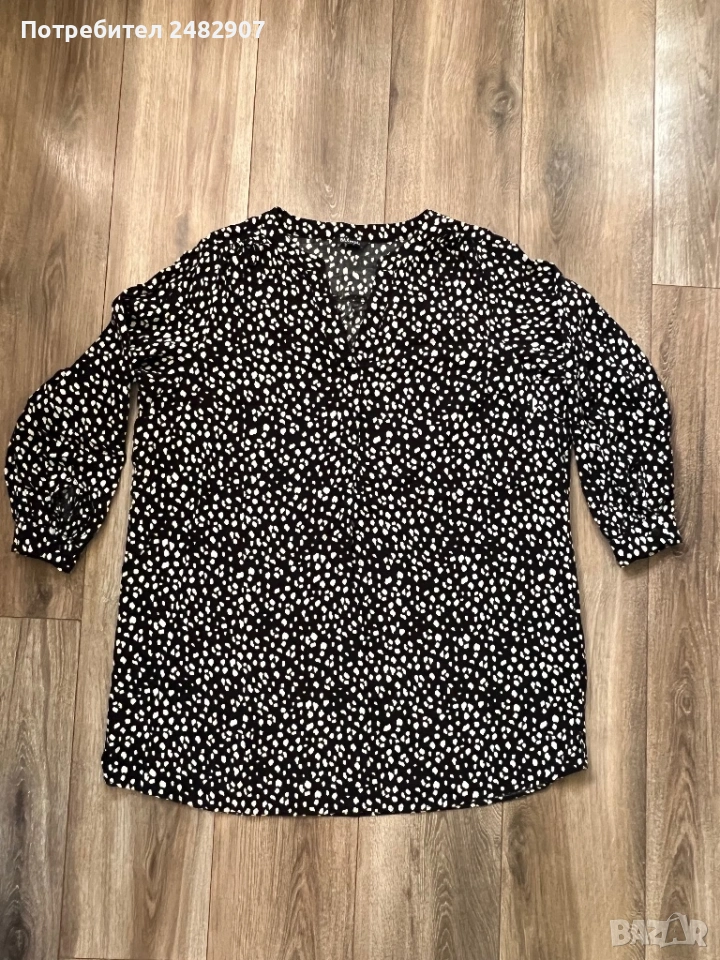 Свободна дамска туника в черно и бяло, размер 44. Съдържа 100 % вискоза. Ширина в раменете - 40 см, ширина под мишниците - 63 см, ширина в долната част - 68 см, дължина от рамото до долу -83 см, дължина на ръкава от рамото - 57 см, ширина на ръкава в долната част - 11 см. Много запазена, почти не е използвана, без забележки.