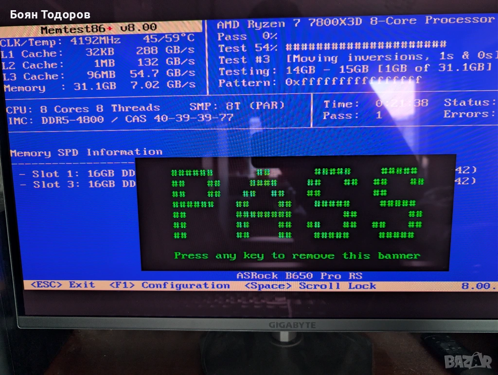 2 x 16 DDR5 UDIMM Samsung M323R2GA3BB0-CQKOL , 4800 MT/s , CL40 , тествана с Memtest86+