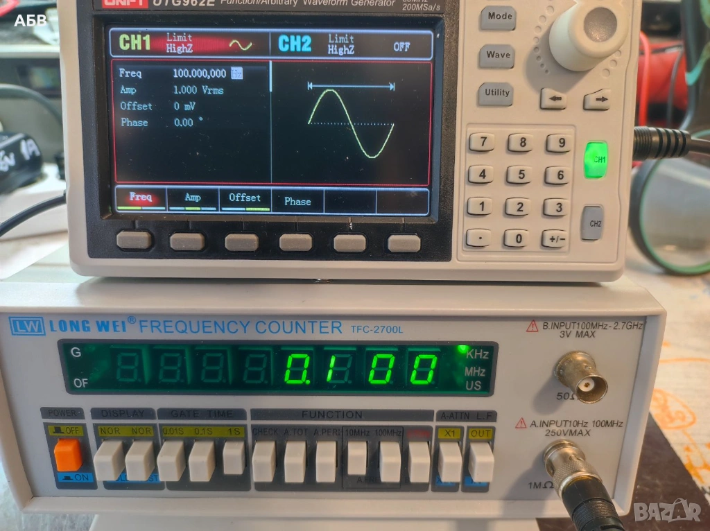 Продава се надежден и високо прецизен честотомер с два входа / обхвата: 10Hz-100MHz и 100MHz-2.7GHz.