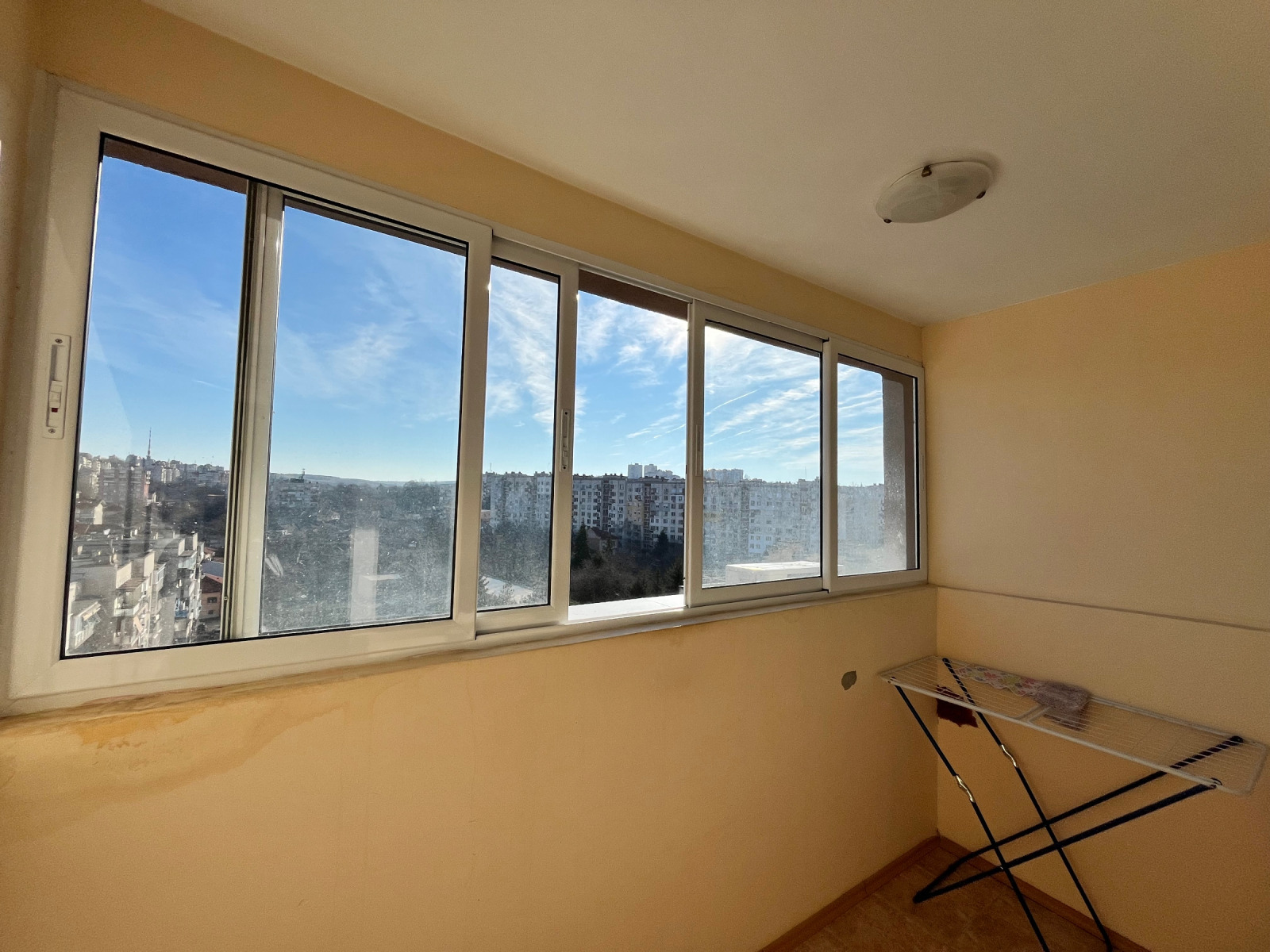 представя светъл и просторен тристаен апартамент с функционално разпределение и впечатляваща панорамна гледка към града. Имотът е разположен на висок етаж, което осигурява изобилие от естествена светлина през целия ден и усещане за простор.