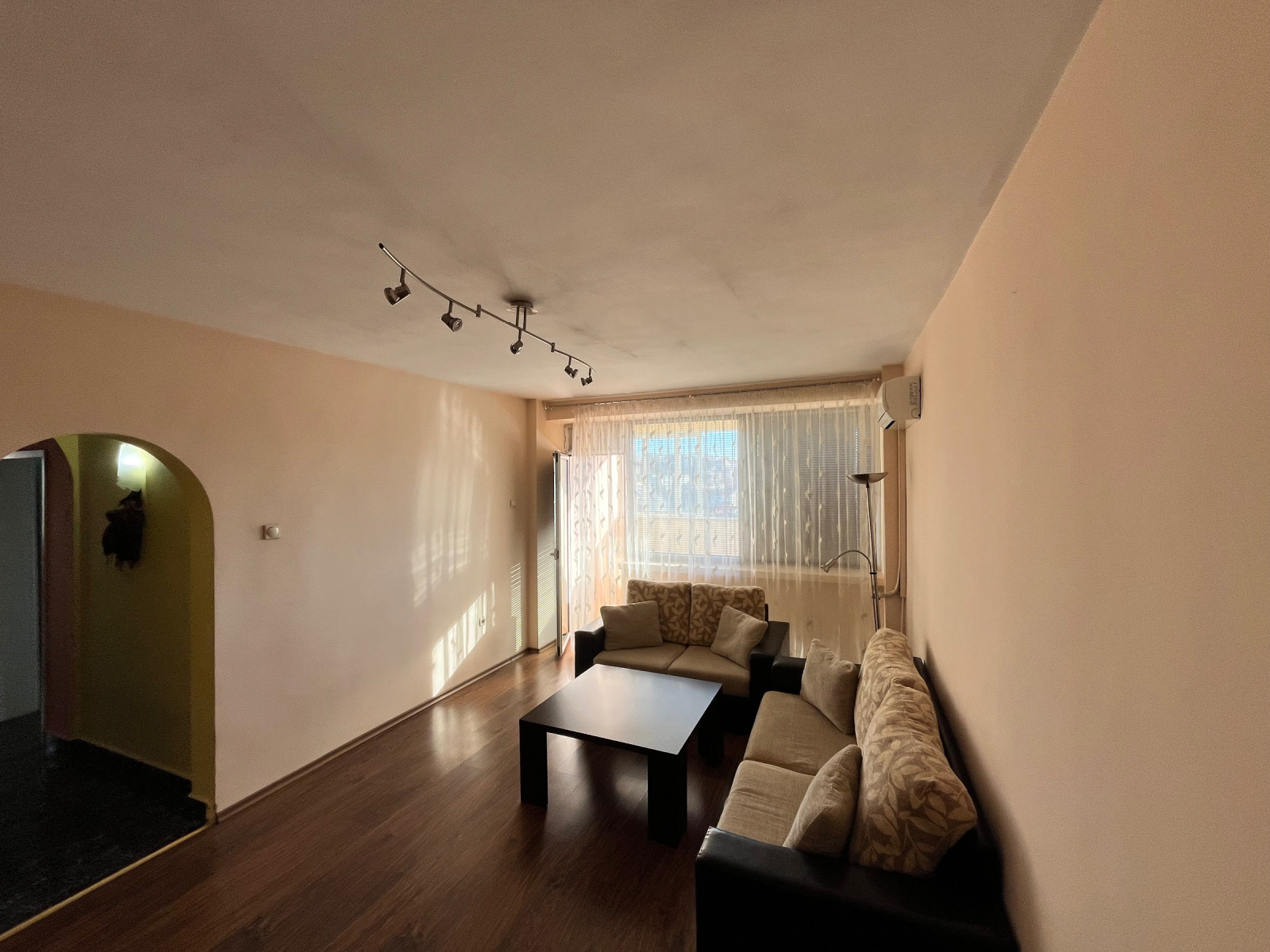 Жилището разполага с уютен и широк хол с обособена зона за почивка и ТВ кът. Пространството е добре организирано, с топъл ламиниран паркет и модерно осветление, което допринася за комфорта и уюта. От хола се излиза към остъклена тераса, от която се открива красива, открита гледка към околността идеално място за сутрешно кафе или релакс след дълъг ден.
