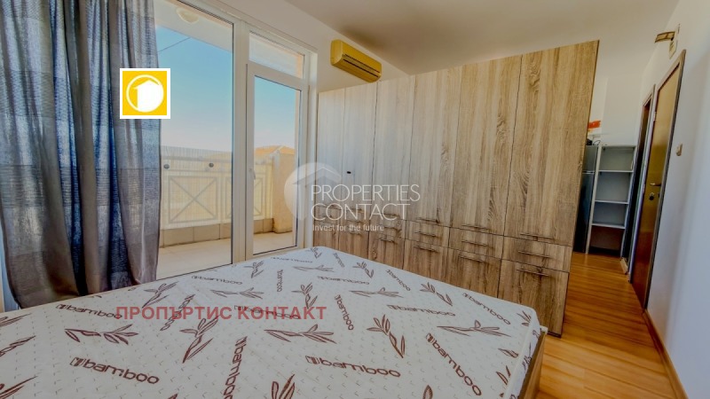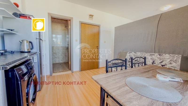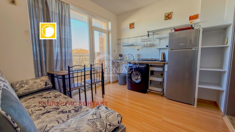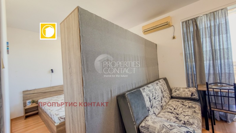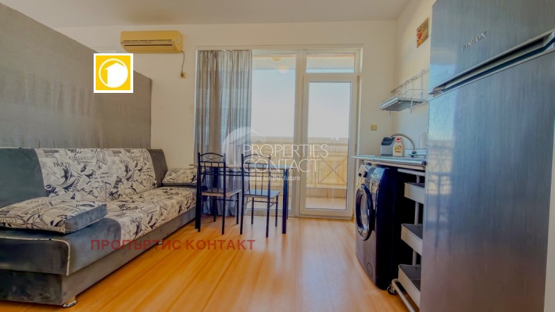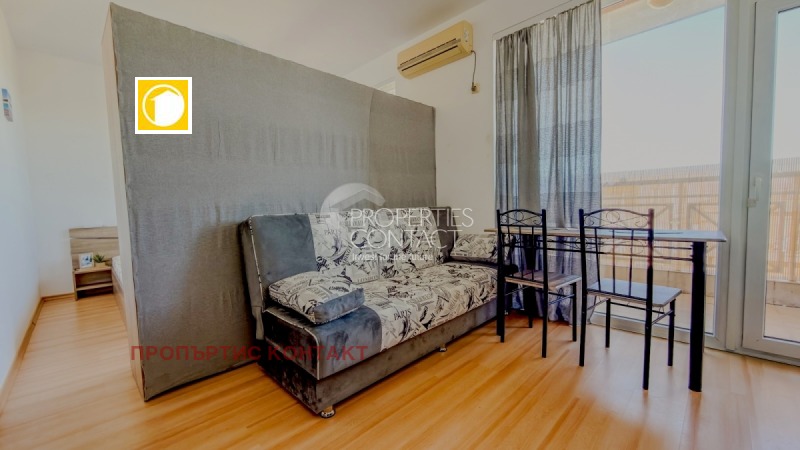 Предлагаме за продажба едностаен апартамент - тип студио в комплекс "Съни Дей 6", разположен на 3 км от Слънчев Бряг. Жилището е на 4 етаж и е с площ от 40 кв.м. с тераса. Апартамент състои се от : секидневна с кухненска зона, оборудвана баня с тоалетна и тераса. Имотът се продава с наличното обзавеждане, климатик и напълно оборудвана баня. Комплекс "Съни Дей 6" е целогодишно работещ и охраняван комплекс, предлагащ множество удобства като фитнес, ресторант, супермаркет, рецепция, 6 външни басейна, 2 мини-голф игрища, тенис корт,спортни площадки, детска площадка и зелени площи за почивка. Разположен е на тихо и спокойно място, на 1,5 км от Аква парка и на 35 км от летище Бургас и 3 км от известния курорт Слънчев бряг,