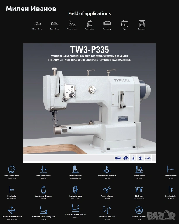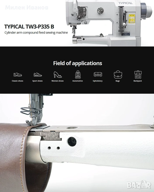 шевна машина VETRON TYPICAL TW3-P335, закупена лично през 2018 г. от официалният вносител за България. Използвана е в малко крафт ателие с минимално натоварване. Машината е в много добро състояние и напълно функционираща. Подходяща е за шивашки ателиета, кожа, обувки, чанти, автомобилна тапицерия и други тежки или средни материали.