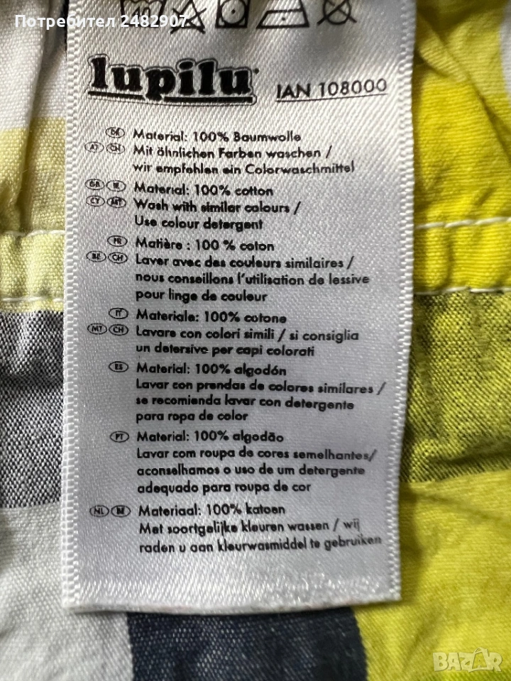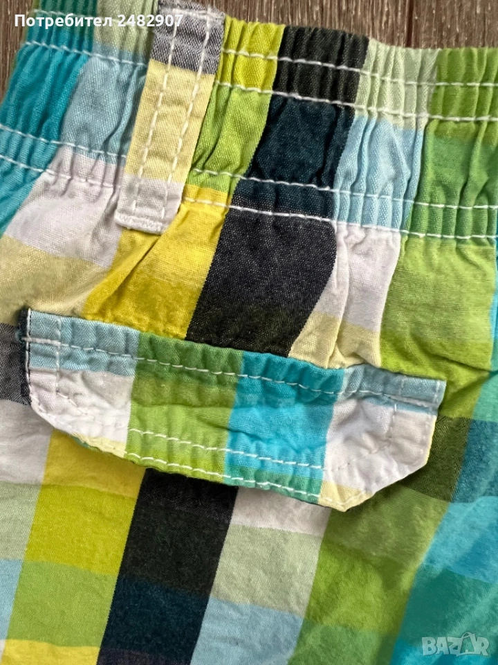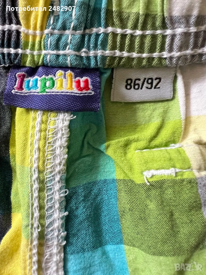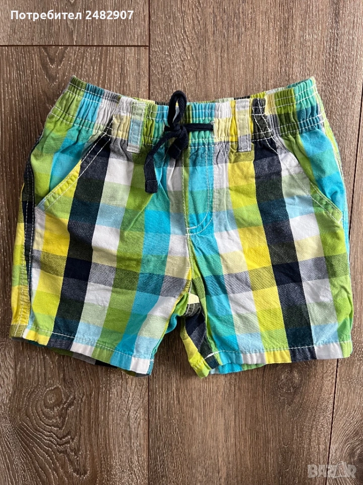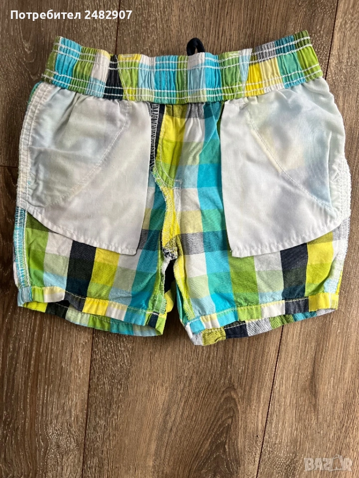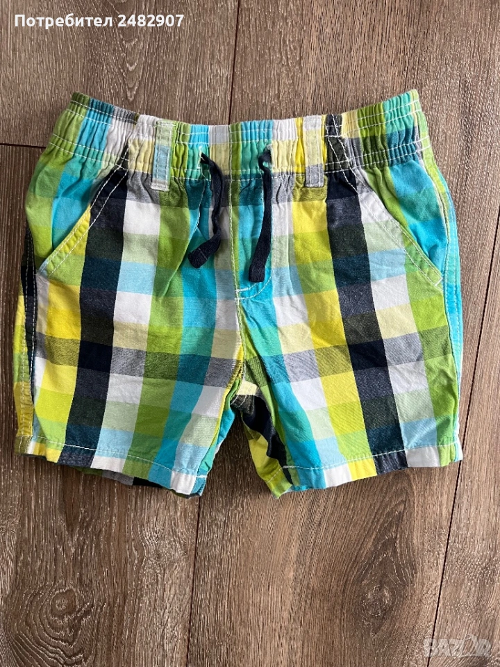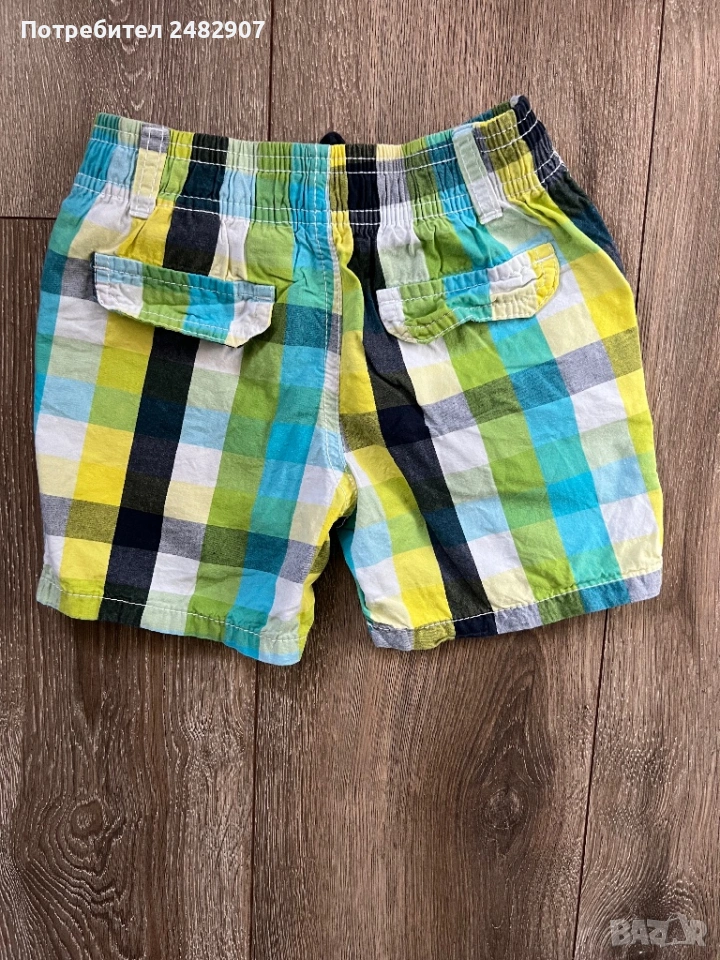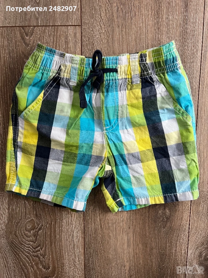 Детски къси панталони за момчета за ръст 86-92 см. Съдържат 100 % памук. Ширина в талията - 25 см, дължина от талията до чатала - 17 см, дължина от талията до долу - 26 см, ширина на крачола в долната част - 17 см. Много запазени, почти не са използвани, без забележки, с ластик и връзки в талията и два джоба.