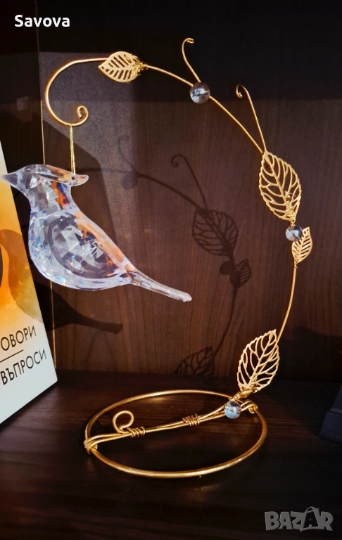 Нежно стъклено пиленце на стойка от позлатена тел с декорация мъниста и позлатени листа.