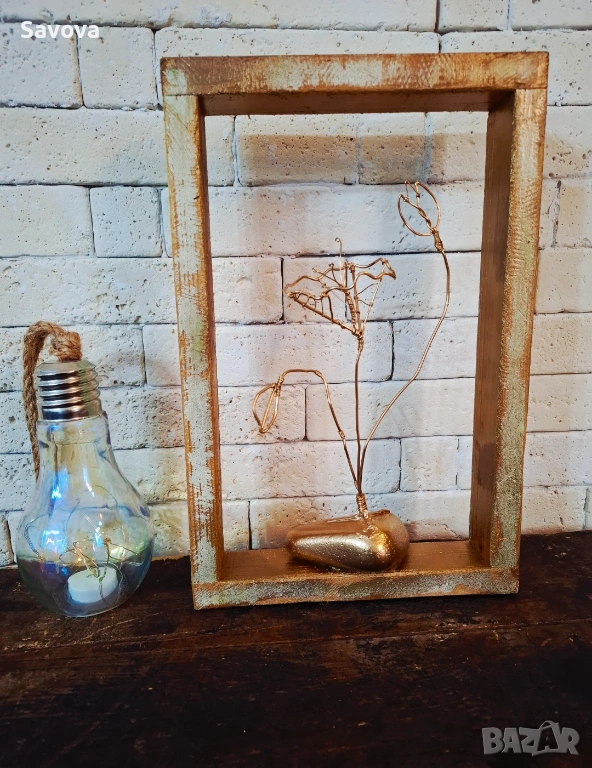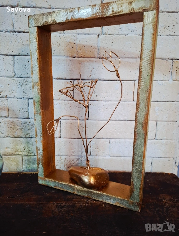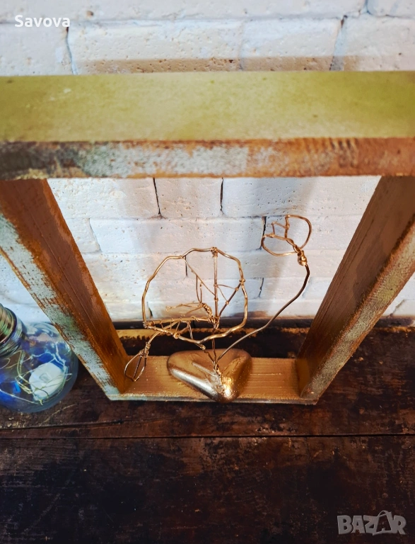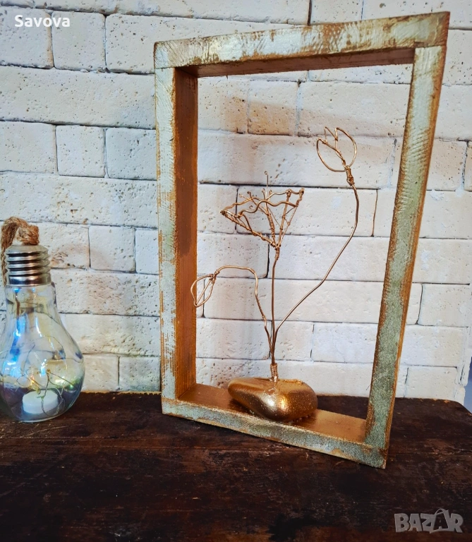 Материали: Ръчно изработена дървена рамка, позлатена тел, естествен морски камък.