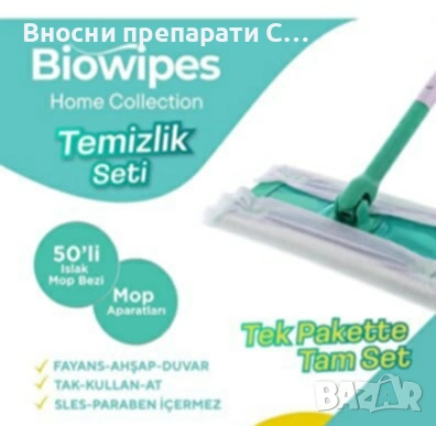 Комплект почистващ моп+ Biowipes 50 броя еднократни парцали за почистване