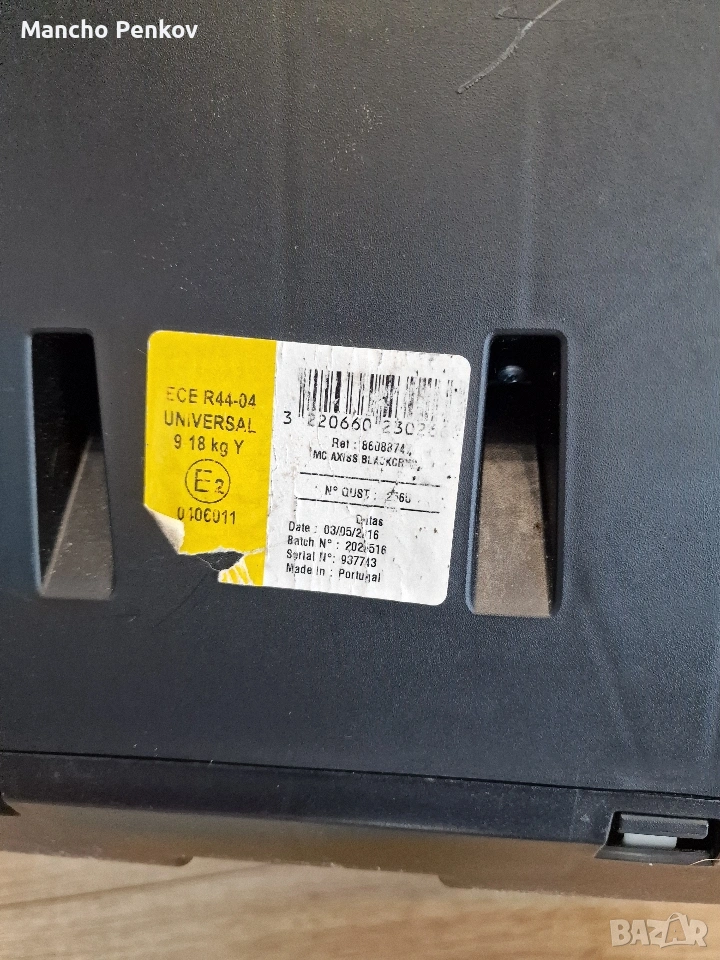 Бебешко столче за кола марка Bebeconfort / Maxi Cosi Модел: Axiss Цвят: Черен За дете от 9 до 18 кг. + втори комплект специални колани Bebe confort Калъфката се сваля и пере, Много е удобно, предпазва главата на детето и на дълъг път може да се облегне и спи, без да се криви вратлето му. Столчето е с функция за завъртане (ротиране на 90 градуса) както наляво, така и надясно, т.е. Можете да си изберете от коя страна на колата да го сложите. Столчето е използвано от двамата ми сина, които пораснаха.