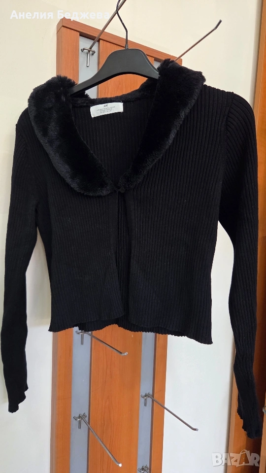 Черна рипсена жилетка с яка с изкуствен косъм.