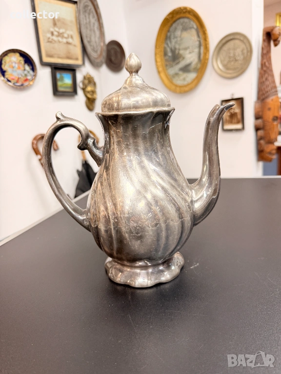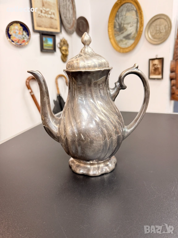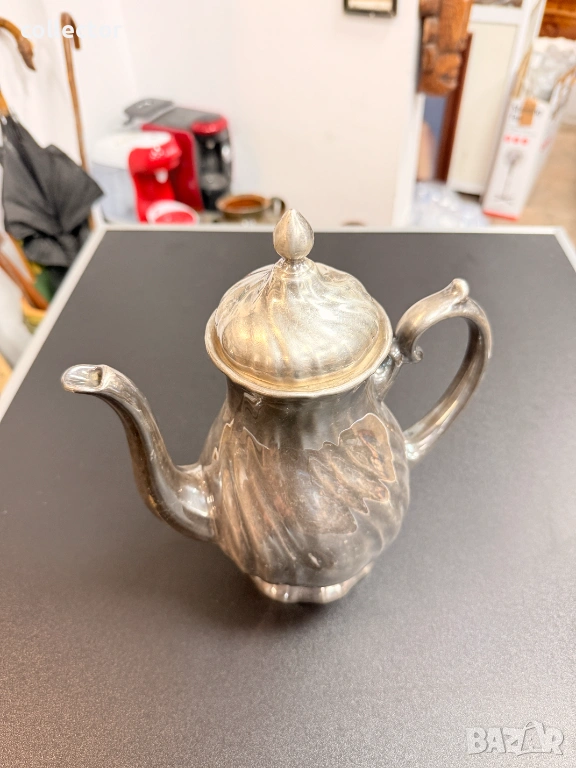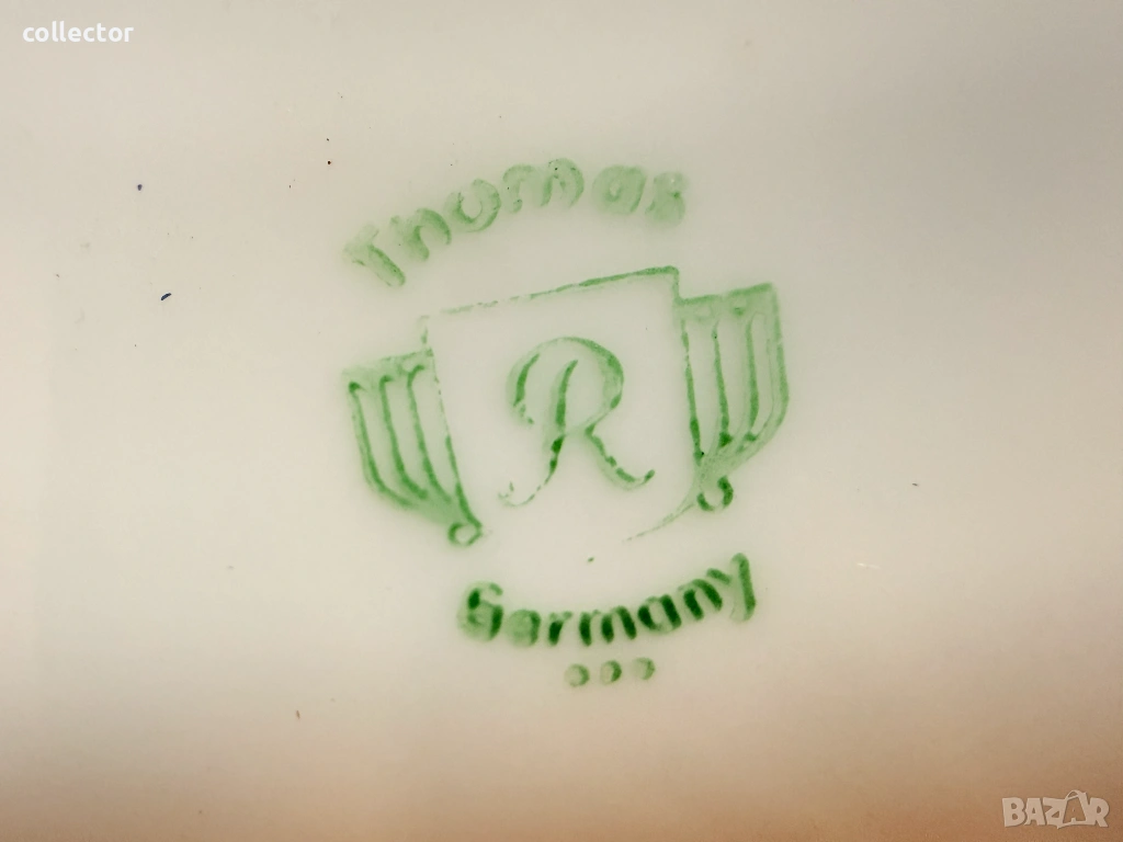 Порцеланов чайник, обвит в посребрено фолио. Този вид посуда е била изключително модера в Германия. Комбинират здравината на порцелана с луксозния вид на среброто. Марката е основана от Фриц Томас през 1903 г. в Марктредвиц, Бавария. През 1908 г. става част от Rosenthal. Състояние видно от снимките.