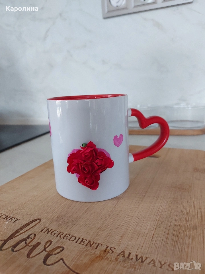 Стилна бяла керамична чаша с червена вътрешност и ефектна дръжка във формата на сърце ❤️