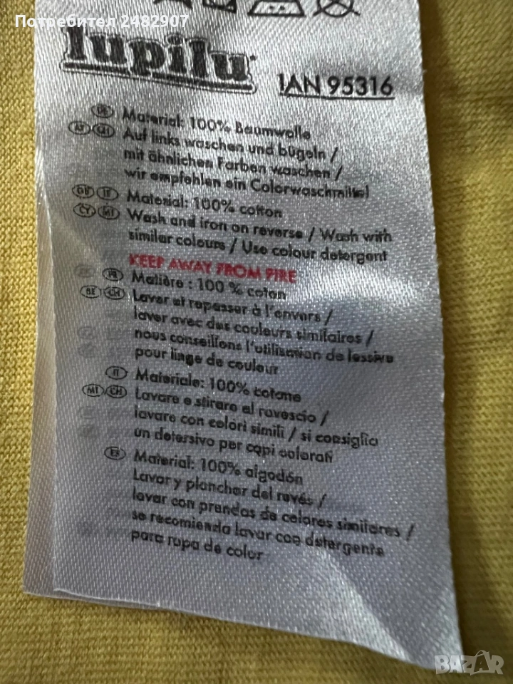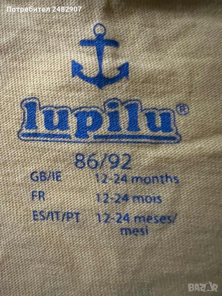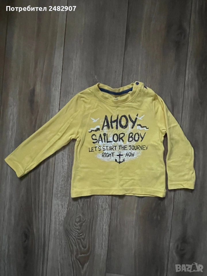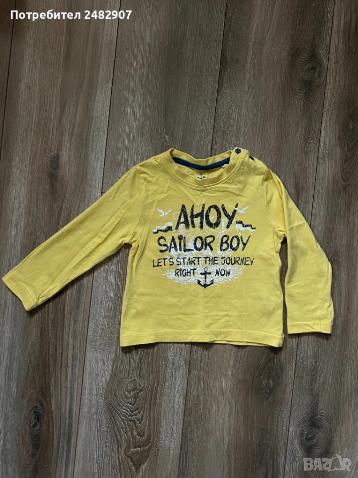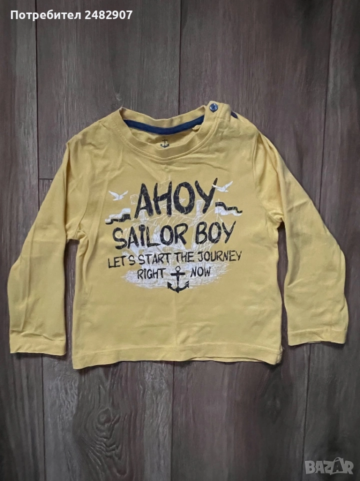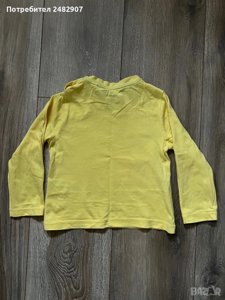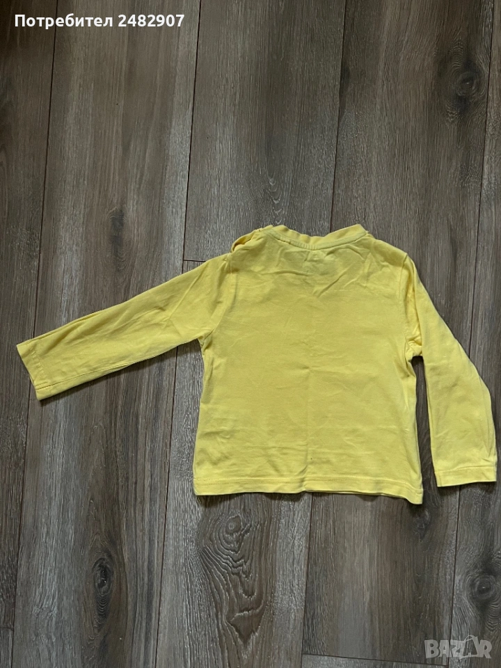 Бебешка блуза с щампа за ръст 86-92 см в жълто и синьо. Ширина в раменете - 24 см, ширина под мишниците - 31 см, ширина в долната част - 32 см, дължина на ръкава от рамото - 33 см, ширина на ръкава в долната част - 8,5 см. Много запазена, почти не е използвана, без забележки.