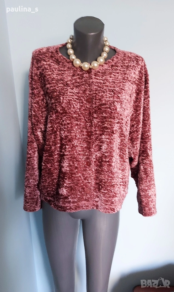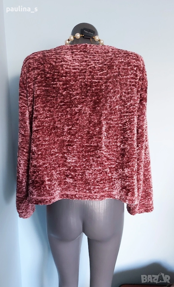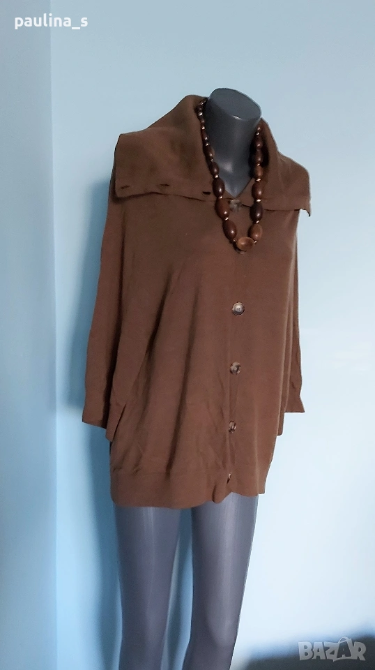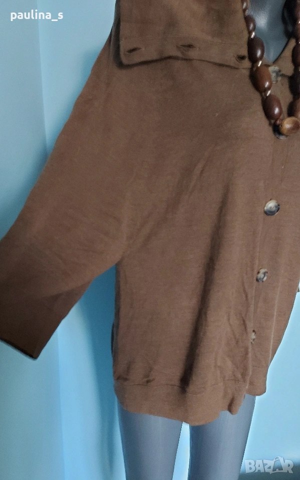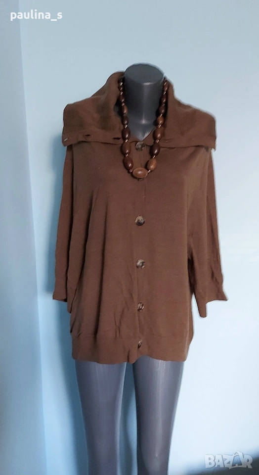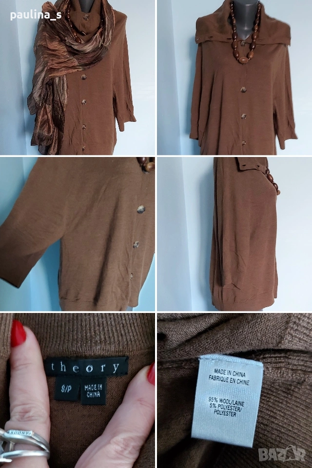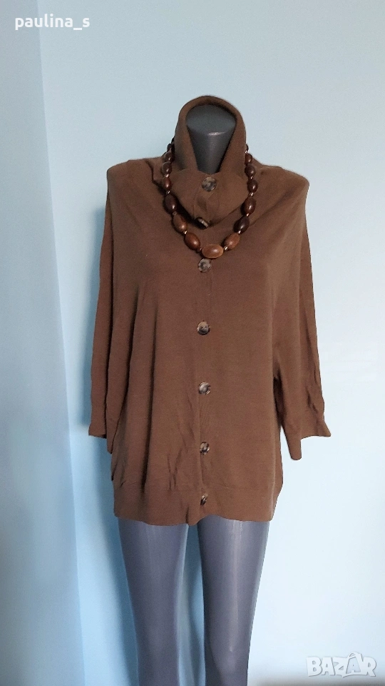 3️⃣ М / 3XL - "theory". Цената е крайна, без пазарлъци 30 евро! Дамска жилетка тип туника с висока и щедра яка, кроп модел с падащи реглан рамене, копчета. По етикет е S, но е уголемена ѝ е унисайз. Цветът е много тренди, материята е разкошна и еластична, не боцка на голо. Една бройка е, без дефекти и етикет, като нова, става за посочените размери, вижте мерките в обявата! Герданът е от дървени мъниста, сандалово дърво, при желание също се продава и ще генерирам отделна обява за него - 9 евро.