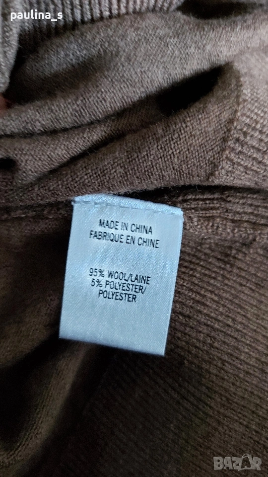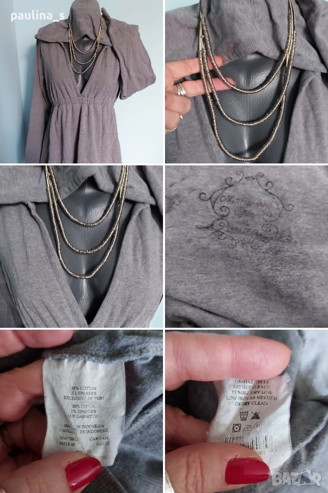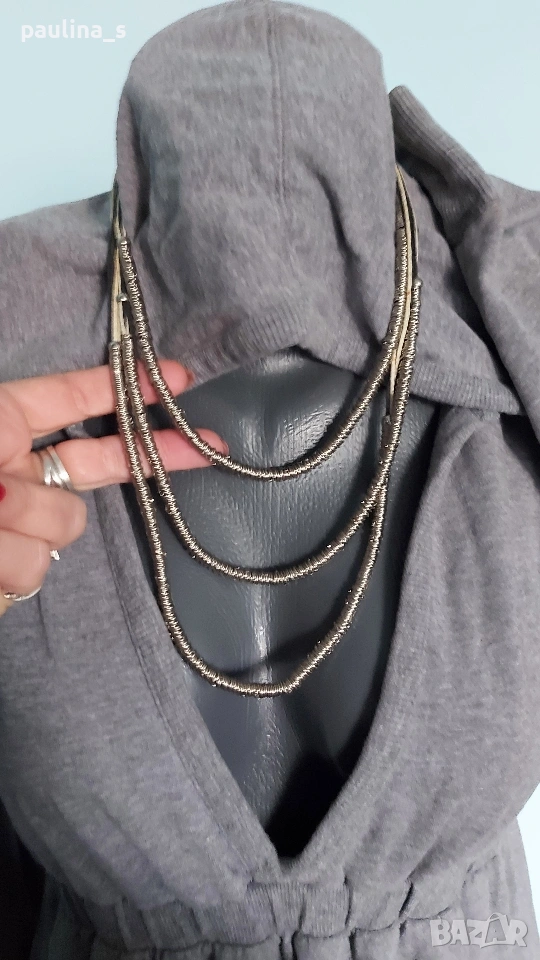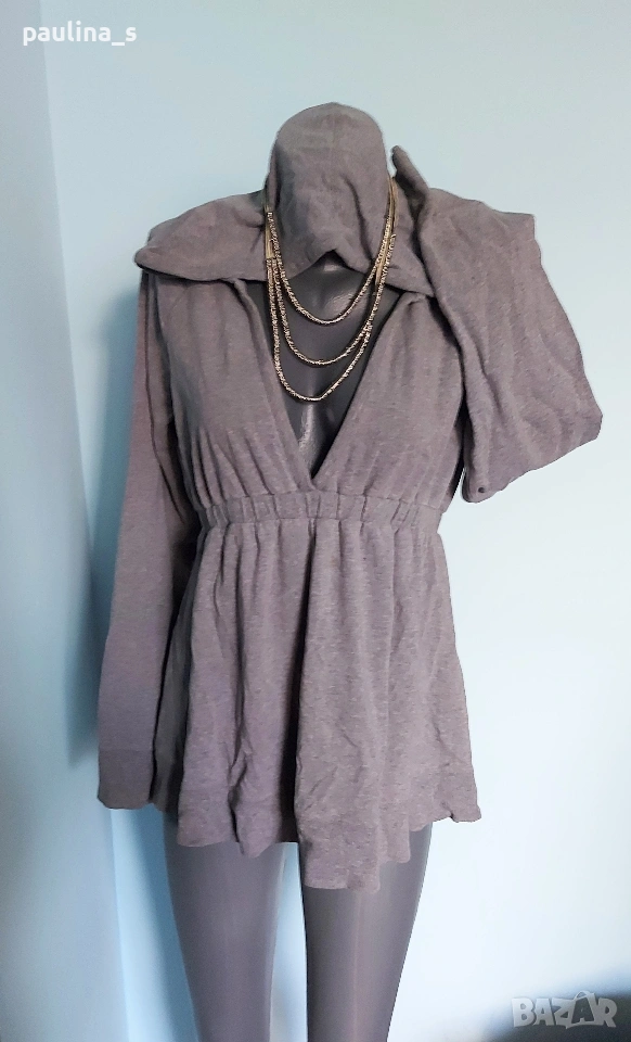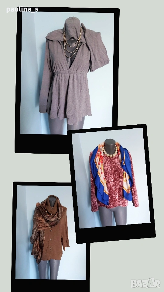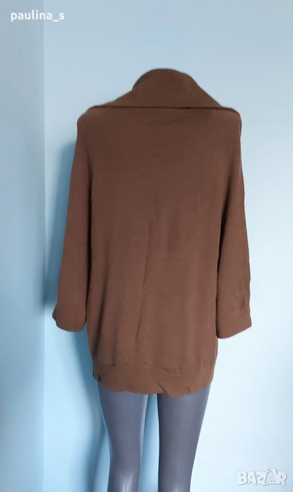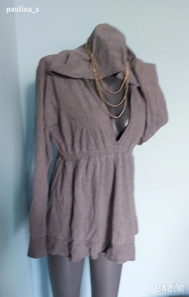 3️⃣ М / 3XL - "theory". Цената е крайна, без пазарлъци 30 евро! Дамска жилетка тип туника с висока и щедра яка, кроп модел с падащи реглан рамене, копчета. По етикет е S, но е уголемена ѝ е унисайз. Цветът е много тренди, материята е разкошна и еластична, не боцка на голо. Една бройка е, без дефекти и етикет, като нова, става за посочените размери, вижте мерките в обявата! Герданът е от дървени мъниста, сандалово дърво, при желание също се продава и ще генерирам отделна обява за него - 9 евро.