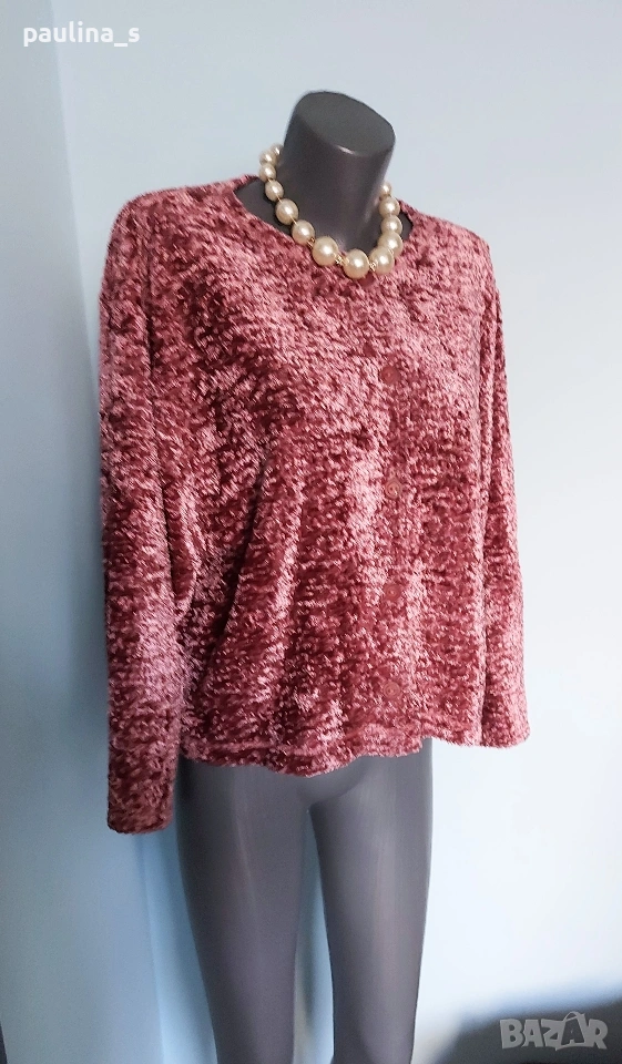 2️⃣. 3XL / 5XL - "Jackie". Цената е крайна, без пазарлъци 20 евро. Една бройка е, вижте мерките в обявата! Дамски топ, кроп модел, тип жилетка, голям размер. Цветът е светла Фуксия. Материята е релефна късокосместа, луксозна със сатенен отблясък, много ефектна дреха, подходяща и за вечерни поводи. Без дефекти, като нов без етикет.