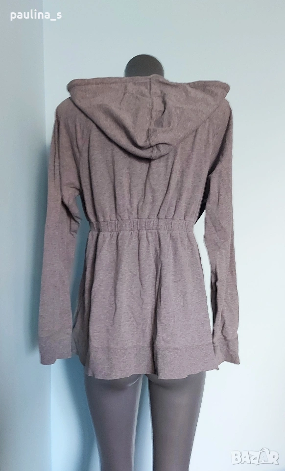 L / 2XL "Monterey" by Frank and Eileen. Цената е крайна, без пазарлъци 15 евро. Еластичен суичър тип туника с качулка, ръкавите са реглан, започват от бието и включват и раменете, набора е точно под бюста с пронизан широк ластик. Материята е 97% памук с 3%ликра. При гладене развалих щампата с бранда и размера, описано е.