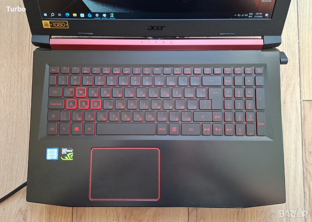 Лаптопът е като нов и е технически безупречен. На 140 дни работа, видно от времето на оригиналното 512GB SSD. Висококачествен геймърски лаптоп от серията Nitro 5 на Acer. Разполага с мощен Intel Core i7-7700HQ процесор с четири физически и 8 логически ядра (8х3.80GHz) и геймърска видеокарта NVIDIA GeForce GTX 1050Ti със собствена 4GB GDDR5 памет. Бързо 512GB NVMe SSD и 16GB DDR4 рам памет. Дисплеят е IPS, матов, Full HD, има и подсветка на клавиатурата.