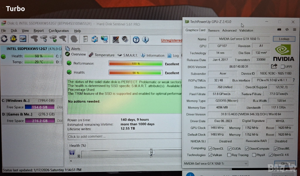 Памет: 512GB SSD NVMe + свободен M.2 SATA слот. SSD-то е на 140 дни работа, на 100% производителност и здраве.