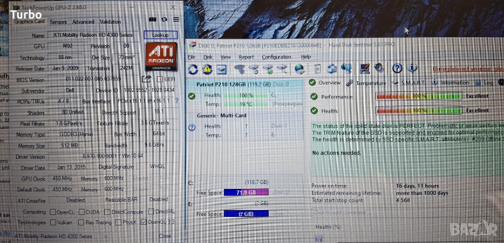 Видеокарта: ATI Mobility Radeon HD 4300 с 512МB собствена памет– надеждна видеокарта със собствена памет и втора Intel HD Graphics.