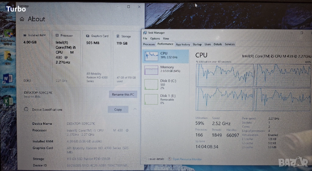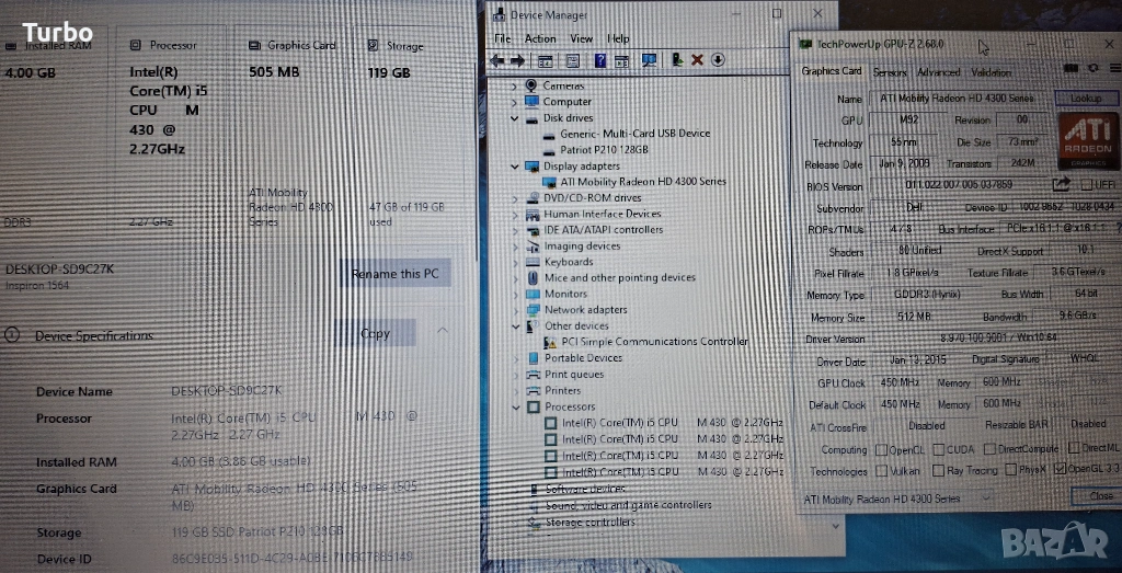 Лаптопът е в добро техническо състояние, със забележки, видни на снимките. Въпреки тях, работи отлично. Има четириядрен процесор Intel Core i5-430M с 4-хипер ядра на 2.5GHz и видеокарта ATI Mobility Radeon HD 4300с 512МB собствена памет. Ъпгрейднат е с чисто нов 128GB SSD диск, с който лаптопът работи бързо и надеждно. Разполага с 4GB DDR3 RAM памет.