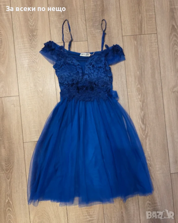 Горната част от деликатна дантела подчертава елегантно силуета, а тюлената пола придава лекота и движение при всяка стъпка. Късата дължина добавя младежко излъчване и прави роклята перфектен избор за бал, коктейл, сватба или официално събитие.