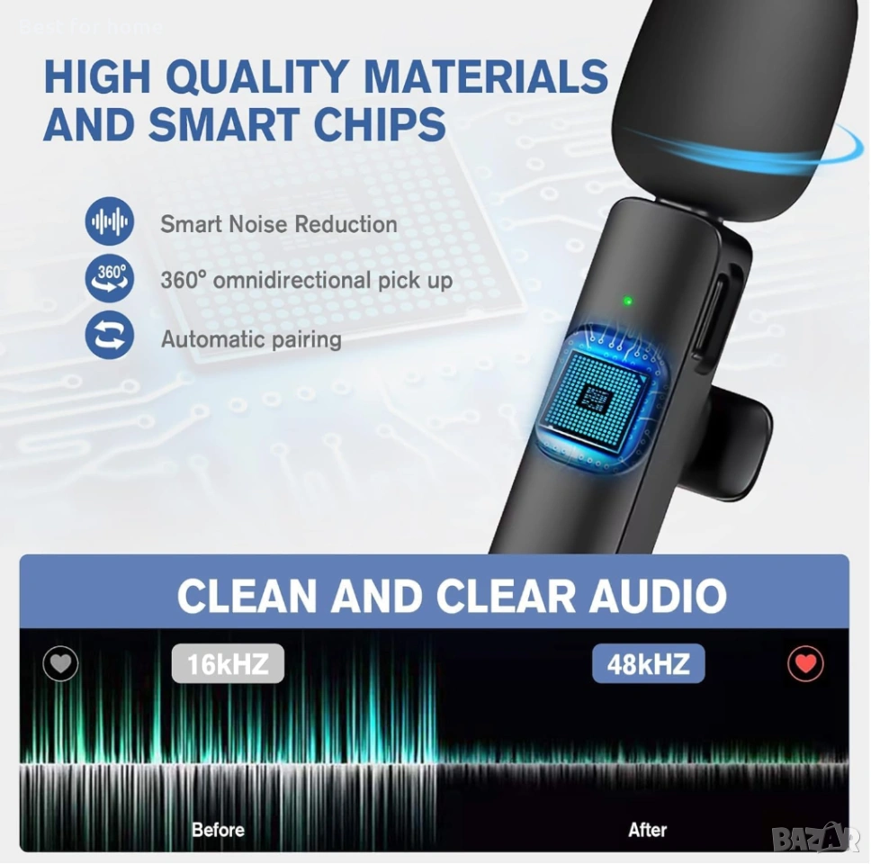 【Ясно качество на звука】Безжичният петличен микрофон е снабден с професионален чип за интелигентно намаляване на шума, който ефективно разпознава оригиналния глас и го записва ясно, може да изолира външния шум, без бръмчене, пукане или лоши аудио проблеми. Нашето устройство записва ясно всеки детайл от звука, независимо от заобикалящата среда, осигурявайки ви ясен звук.