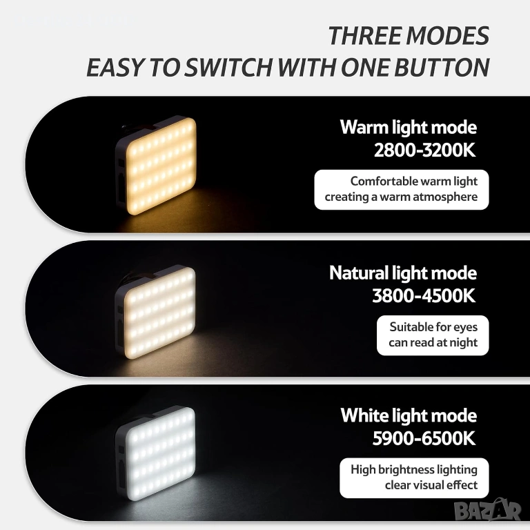 Разполага с 3 режима на светлина според ситуацията: топла светлина, естествена светлина и студена бяла светлина. Позволява плавно регулиране на яркостта.