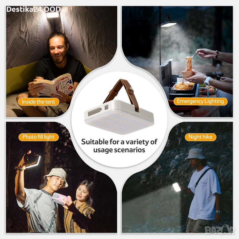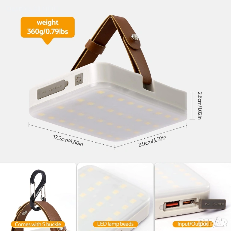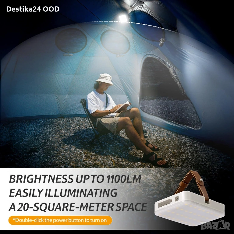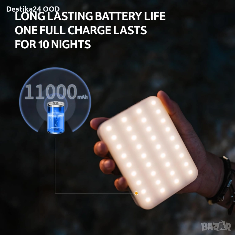 Мощна акумулаторна къмпинг лампа с до 1100 лумена яркост и голяма батерия 11000mAh. Подходяща за къмпинг, риболов, планина, пикник, аварийно осветление или използване в гараж и мазе.