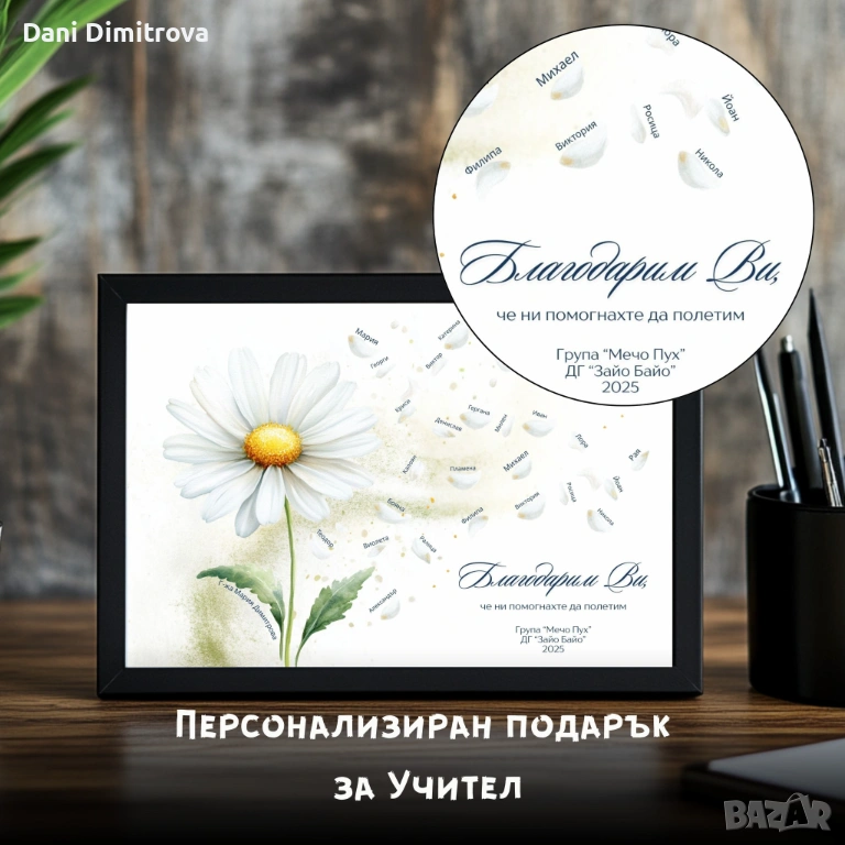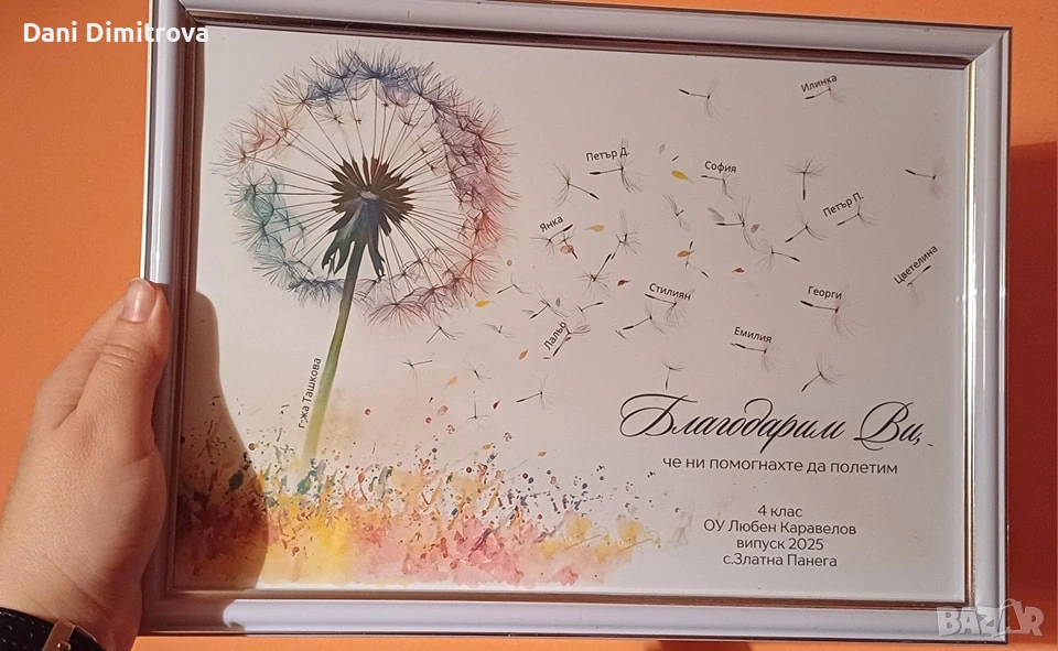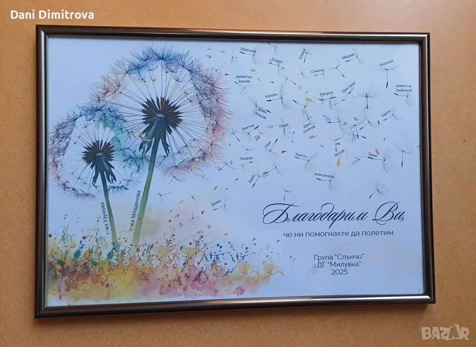 - Персонализиран дизайн – глухарчето представя учителя, а всяко разлетяло се семенце носи името на дете от класа/групата.