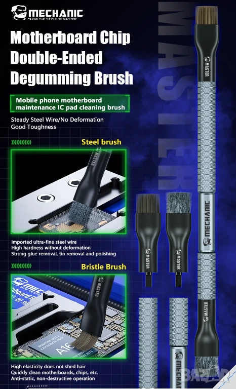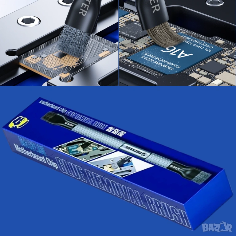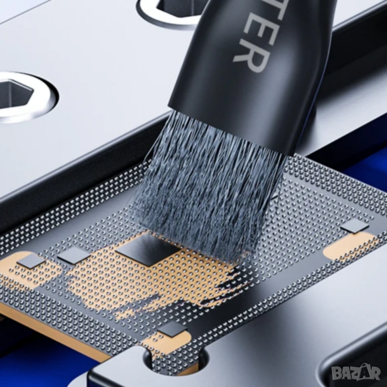 Премахване на лепило и калай: Помага при почистването на чипове (IC), процесори (CPU) и подложки на платки от излишно лепило или калай след разпояване.