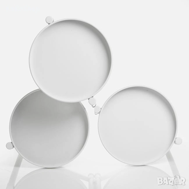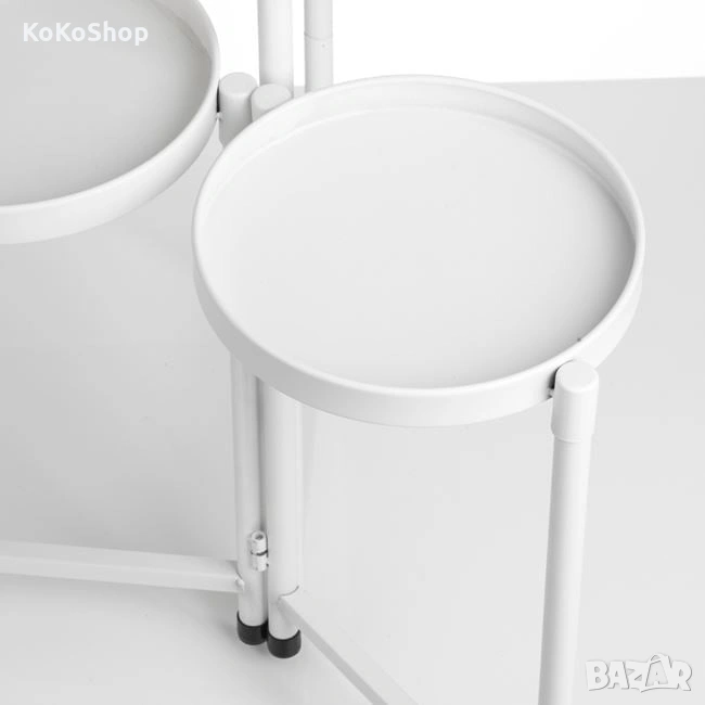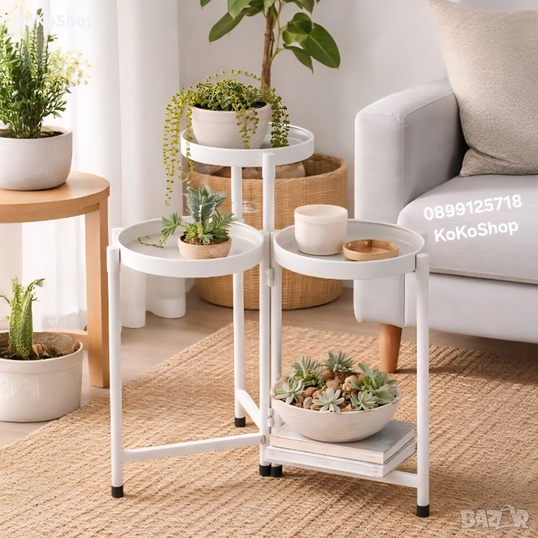 Бял метален цветарник на три нива. Модерен,практичен и функционален, той е подходящ за всеки интериор. Освен за стайни растения, може да се използва и като поставка за декоративни елементи.