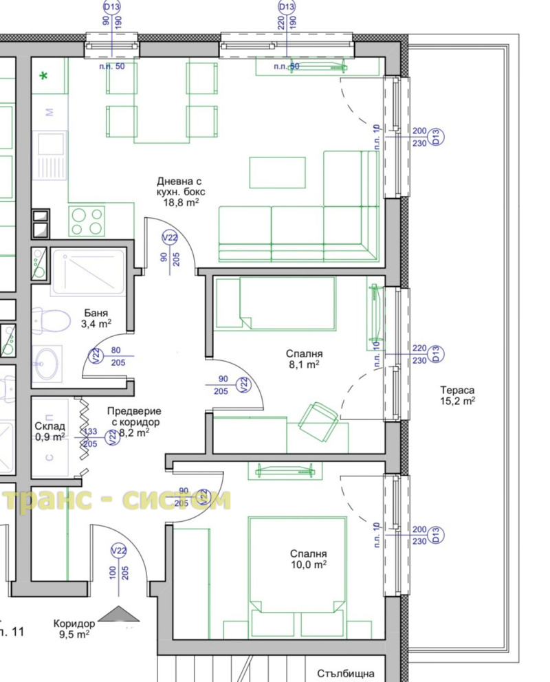 - Застроената площ е 78.41м2, а с общите части е 88.03м2. Състои се от две спални, просторна дневна, баня с WC, голямо антре с място за вграден гардероб, склад и голяма тераса на всички стаи, която предлага прекрасна гледка.