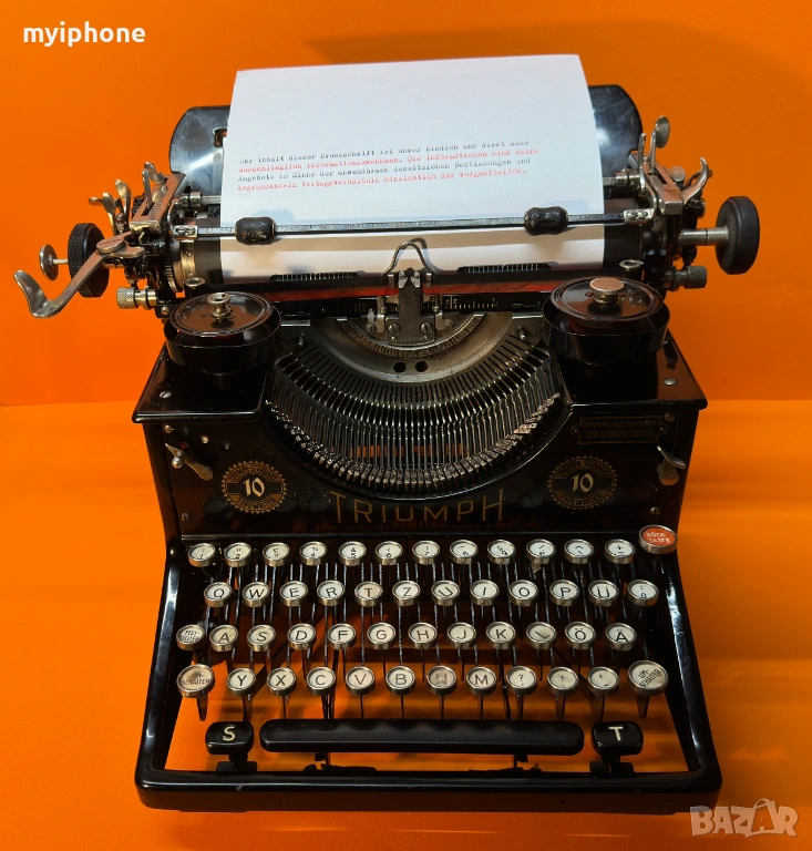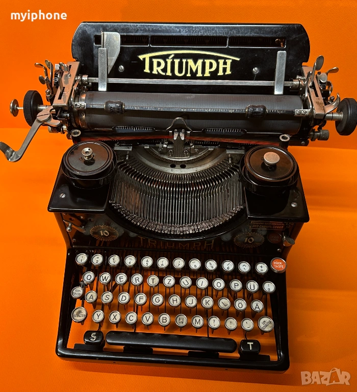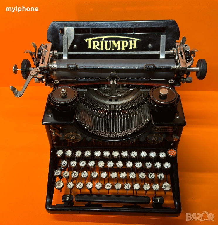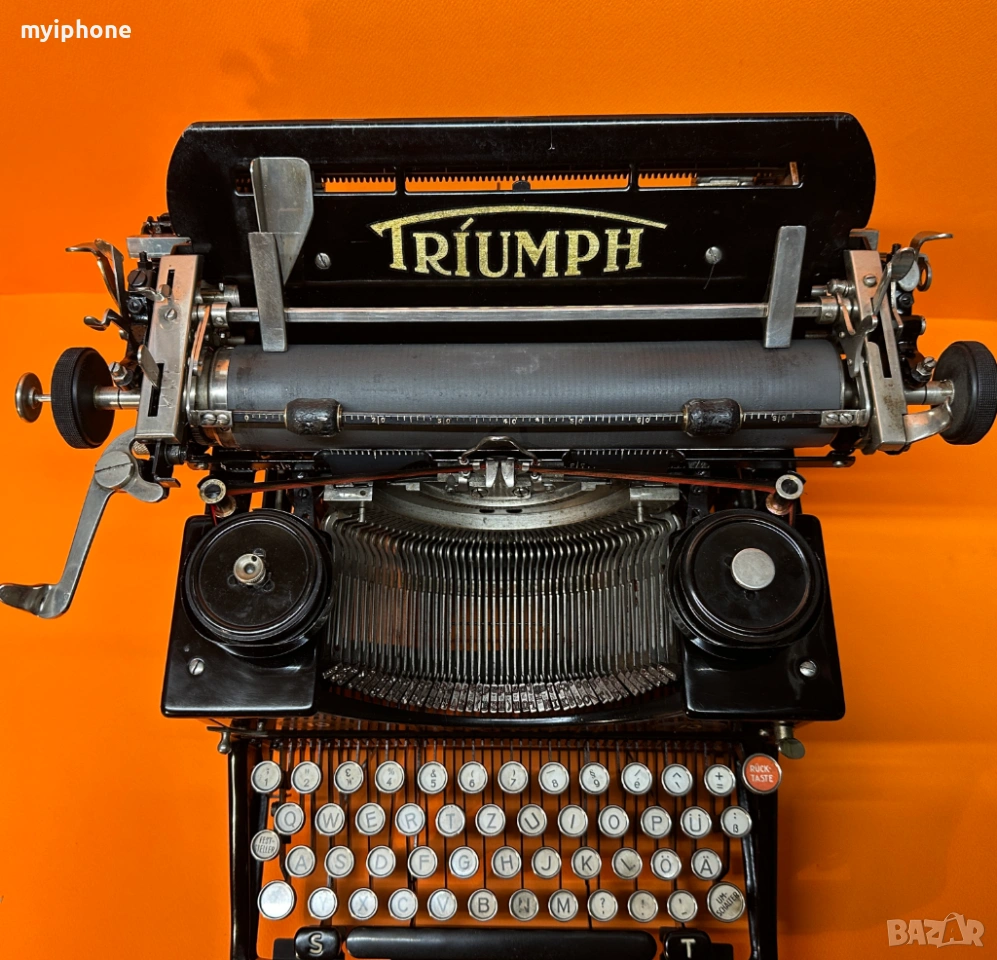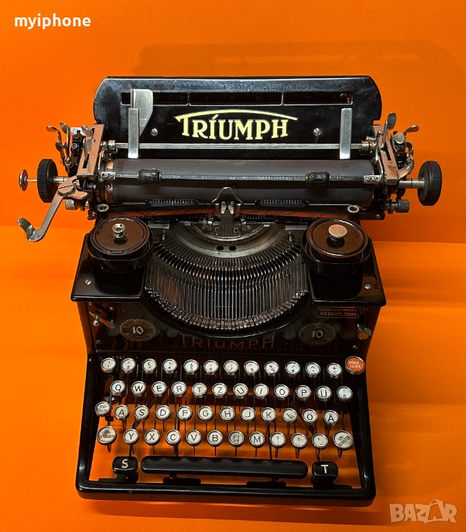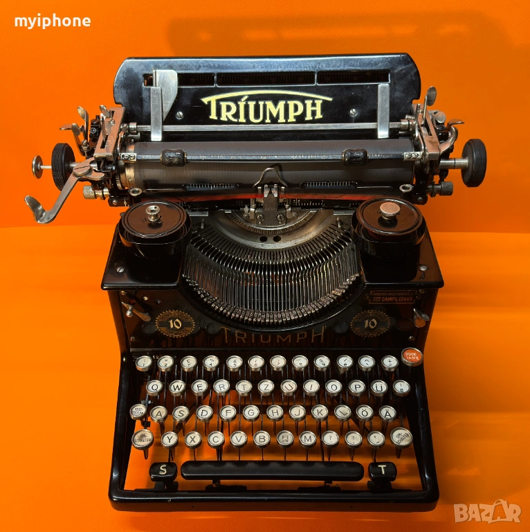 Пишеща Машина TRIUMPH 10 1930 г. за Генерално Представителство Лео Сафиръ София / Напълно обслужена смазана и работеща перфектно на 2 цвята ,сменена лента,qwertz клавиатура топ състояние за годините си,може да се прати клип как работи ! Работим с Еконт 10 % Отстъпка от цената на доставката ! Изпращане същия ден като на другия ден е при вас с опция преглед и тест ако е възможен такъв, допълнително договаряне за друг ден за доставка. Нужни данни за поръчка 1. Име и Фамилия 2.Телефонен номер 3.Град и Офис на Еконт до който искате да се достави или точен адрес за доставка до дома ви / За София възможно взимане от място след уговорка / Изпращане с Еконт / Доставяне от нас в рамките на София Цена 15 €.