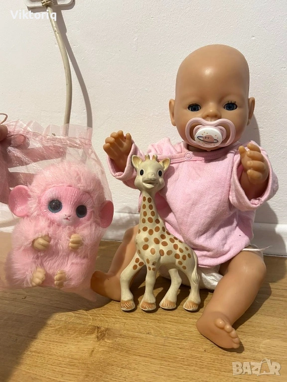 Момиче бейби борн пишка и плаче с памперс и биберон с играчка и плюшено