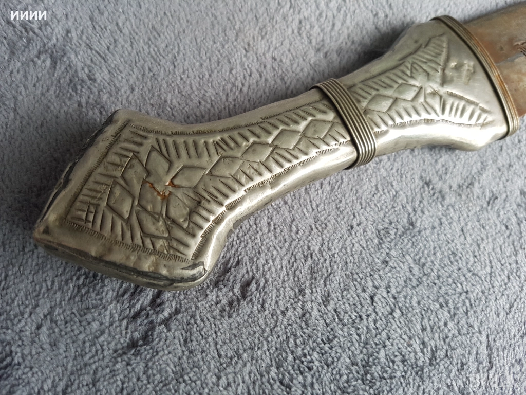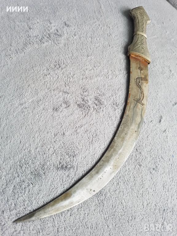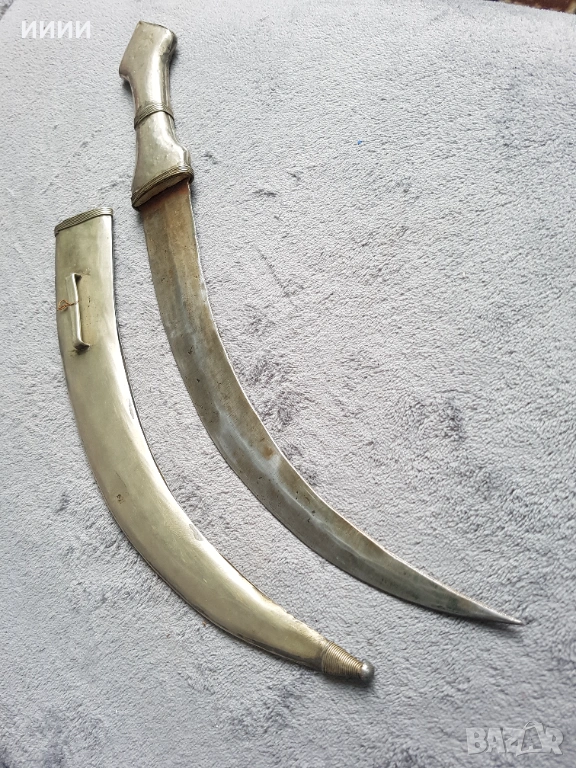 Изкован в средата на 19-ти век. Острие с арабски символи от едната му страна, двуостро заточено и силно резливо, като бръснач. Дръжка от сребро висока проба гравирана, кания със сребърен обков, висока проба,гравирана,а отвътре е дървена. Обща дължина без канията 46 см. Рядка находка,ползвана по времето на Османската империя.