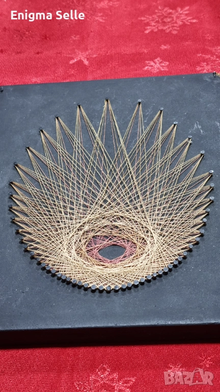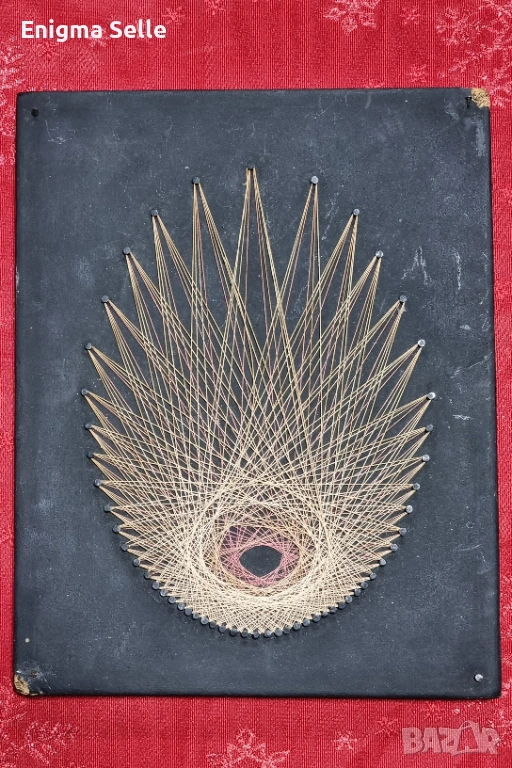 Това произведение на изкуството е пример за Стринг арт (String art), популярна техника от 70-те години, която включва опъване на конци между забити пирони.