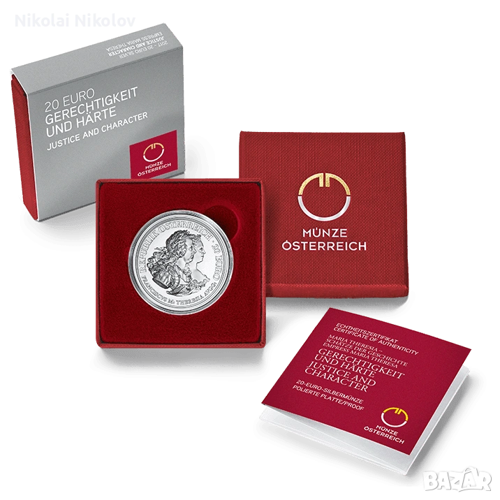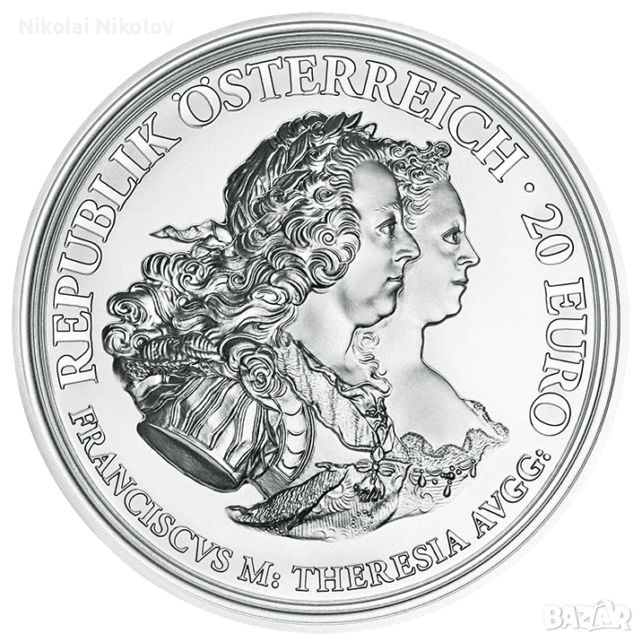 Изключително красива юбилейна евро монета, на която са изобразени имперската двойка - Мария Терзия и имп. Францис I. Монетата е сечена да отбележи 300 годишнината от раждането на императрица Мария Терезия, единствената жена управлявала в Хабсбургската история. Монетата идва със специална кутийка за съхранение и сериен номер/сертификат към нея.