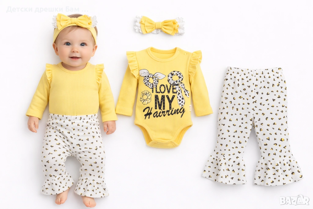 Бебешки комплект 3 части за момиче – боди, панталон и лента