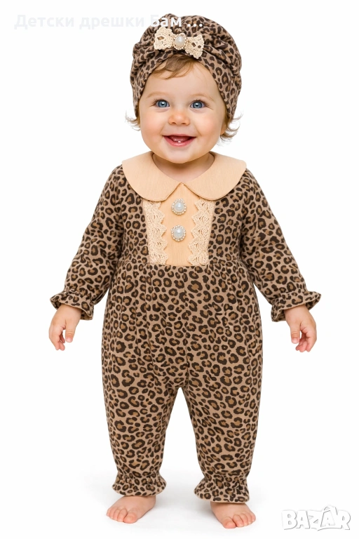 Стилен бебешки ромпър за момиче в модерен леопардов десен с включен турбан (шапка).