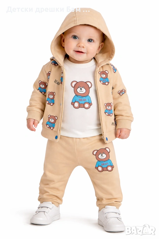 Бебешки комплект от 3 части за момче – суитшърт с качулка, боди с дълъг ръкав и панталон с принт мече.