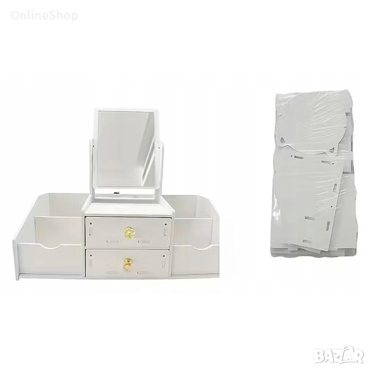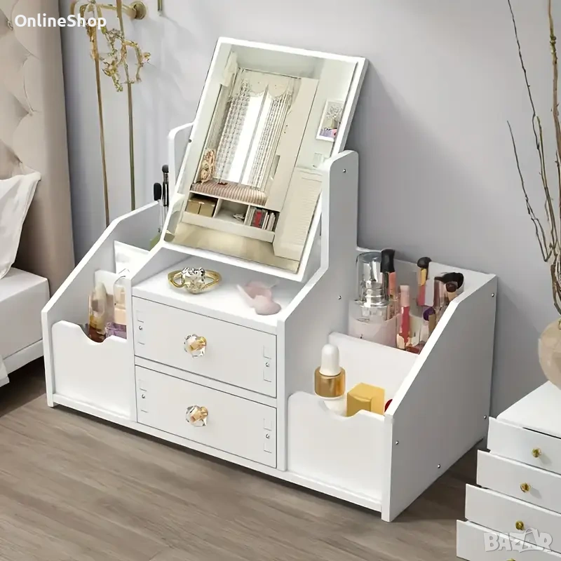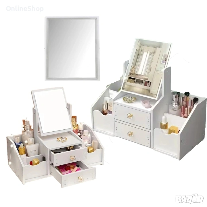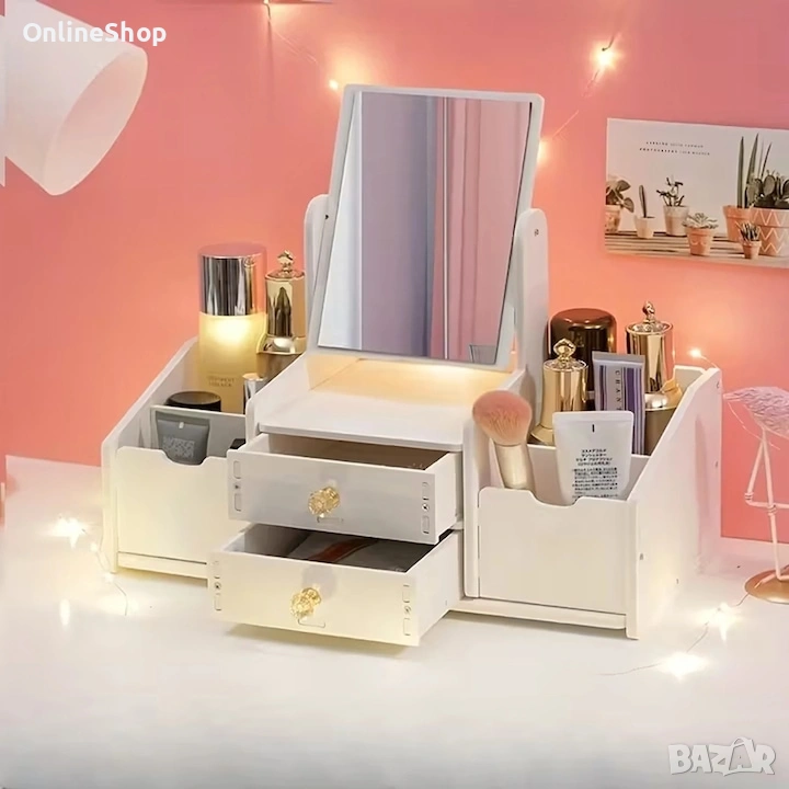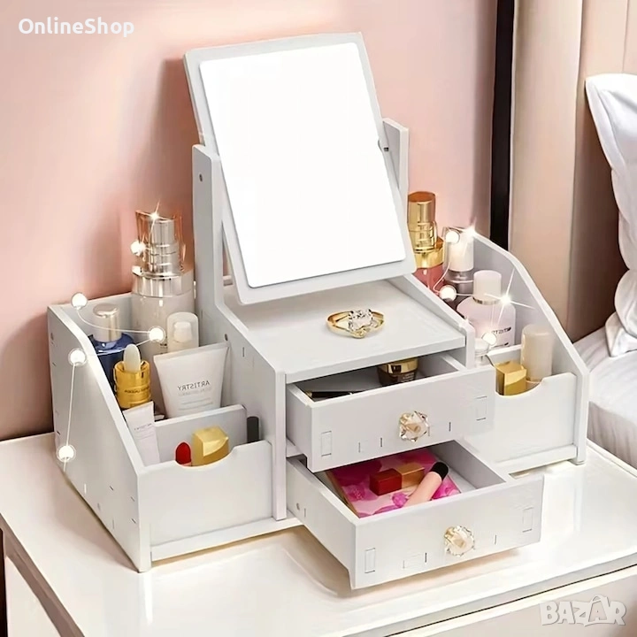 Многофункционалният органайзер за грим с огледало е стилно и практично решение за съхранение на козметични продукти, аксесоари и гримове. Той е проектиран с удобни отделения и чекмеджета, които помагат за лесната организация на любимите ви продукти.