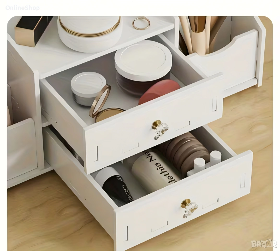 Две чекмеджета и отделения за различни видове козметика и аксесоари;