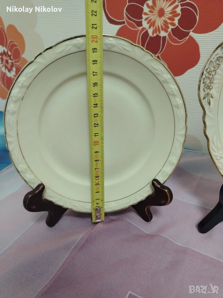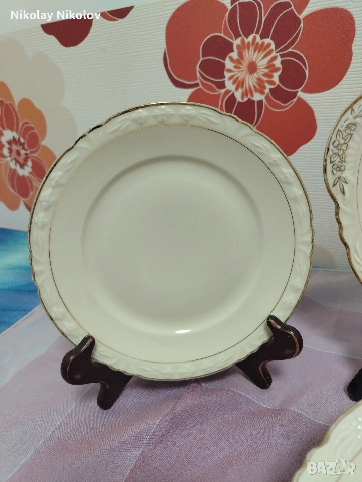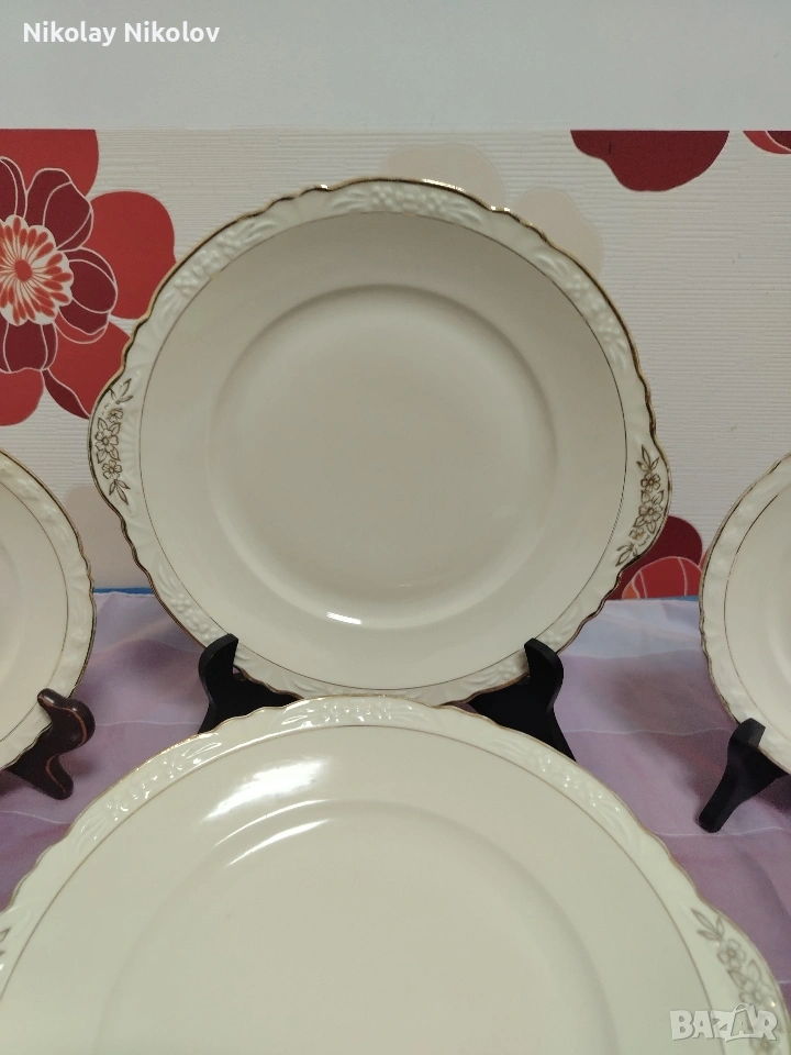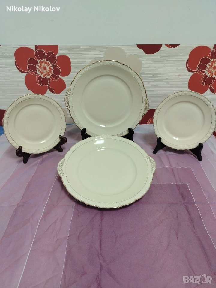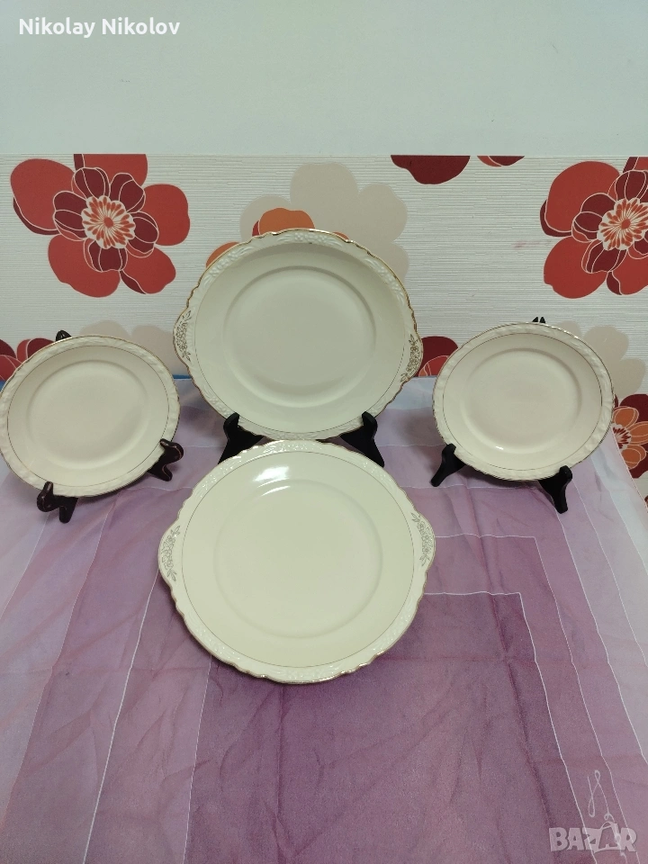 Предлагам прекрасна изработка на порцеланови чинии комплект от 4 броя две плата и две чинии с красиви декоративни орнаменти и цветове без абсолютно никакви забележки