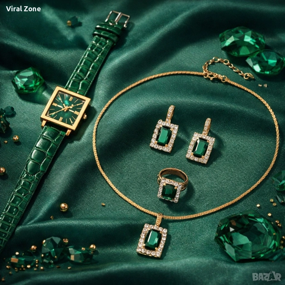 Елегантен комплект часовник и бижута с зелени кристали и златист корпус